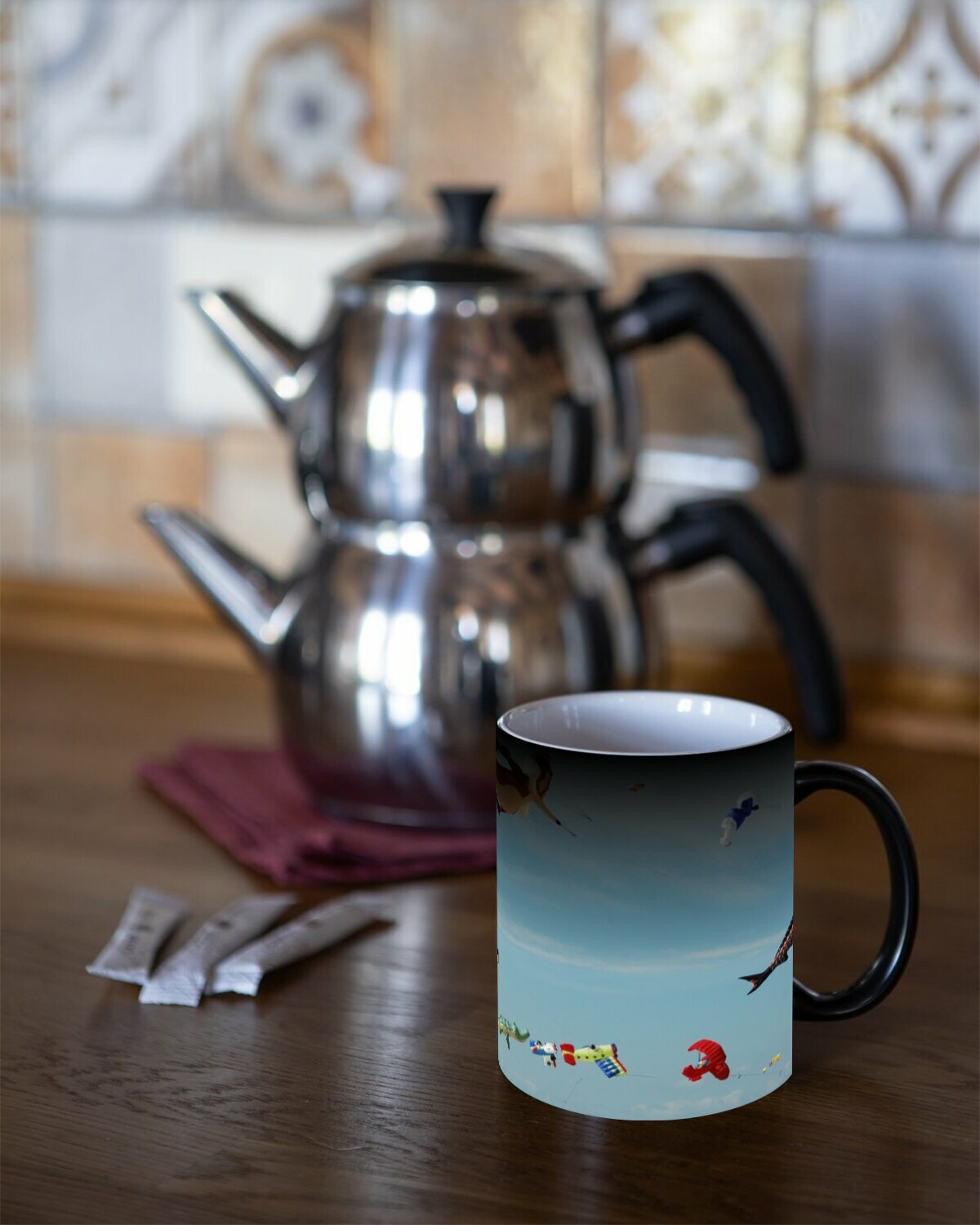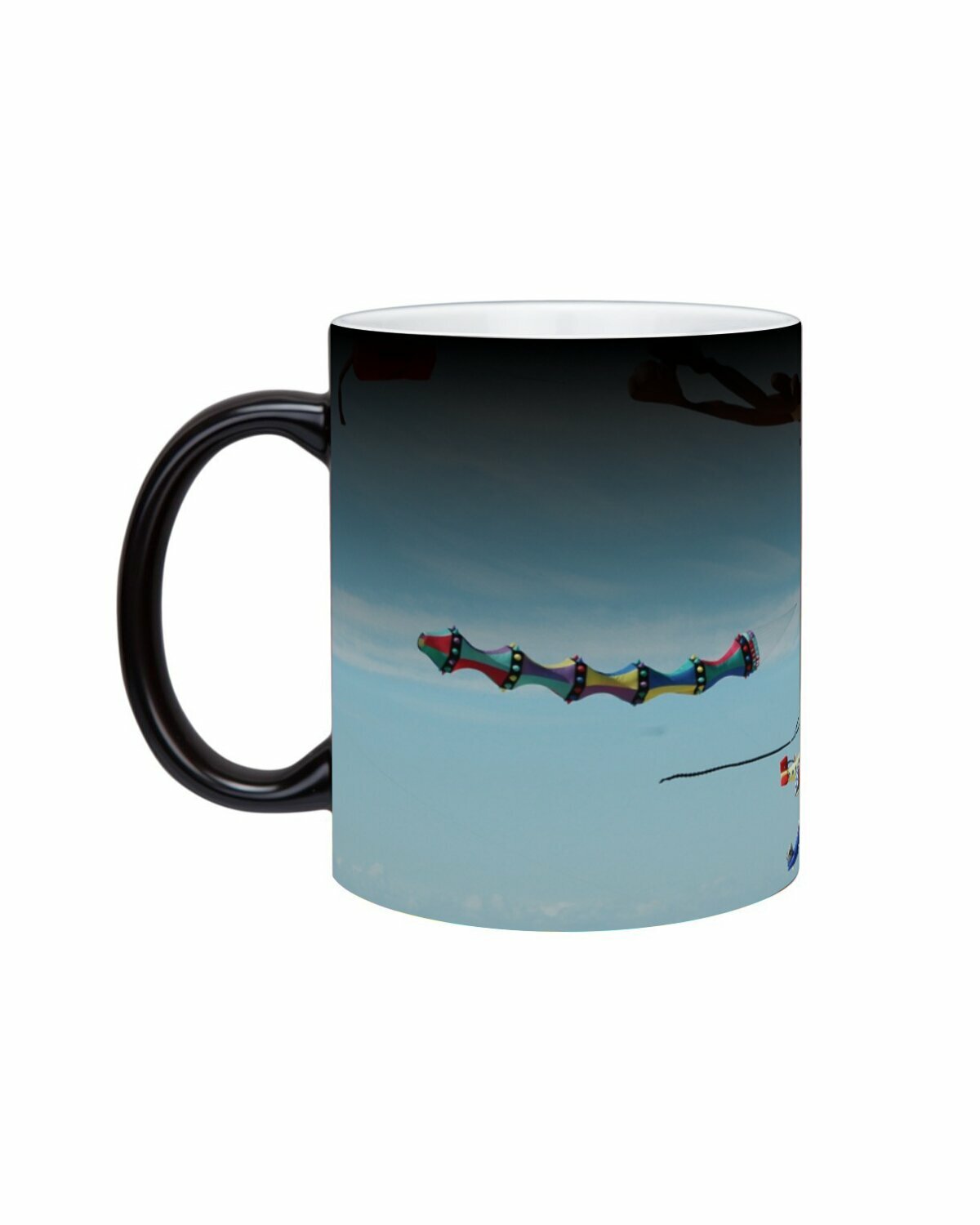 Купить Кружка хамелеон с принтом "Летающий змей, пляж, колыбель" 330 мл.