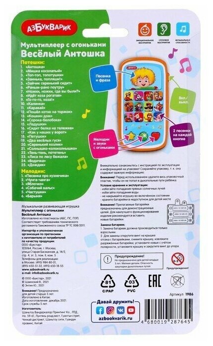 -Большое количество детских потешек и песенок. -Мерцающие огоньки на трех нижних кнопках, при том очень удобная панель. -Соответствие картинки на кнопке и смыслам песенок. -На одной кнопке по две песенки. На нижних кнопках различные звуки (по 6 на каждой) -Яркий красочный дизайн. -Удобно лежит в руке ребенка, тк на задней панели имеются нарисованные цифры и буквы, что создает шершавость и не дает выпасть из рук. -Очень достойная бюджетная цена для такой многофункциональной игрушки. -Динамик не громкий и не тихий, приятный слуху. -Есть кнопка вкл/выкл на боковой панели |