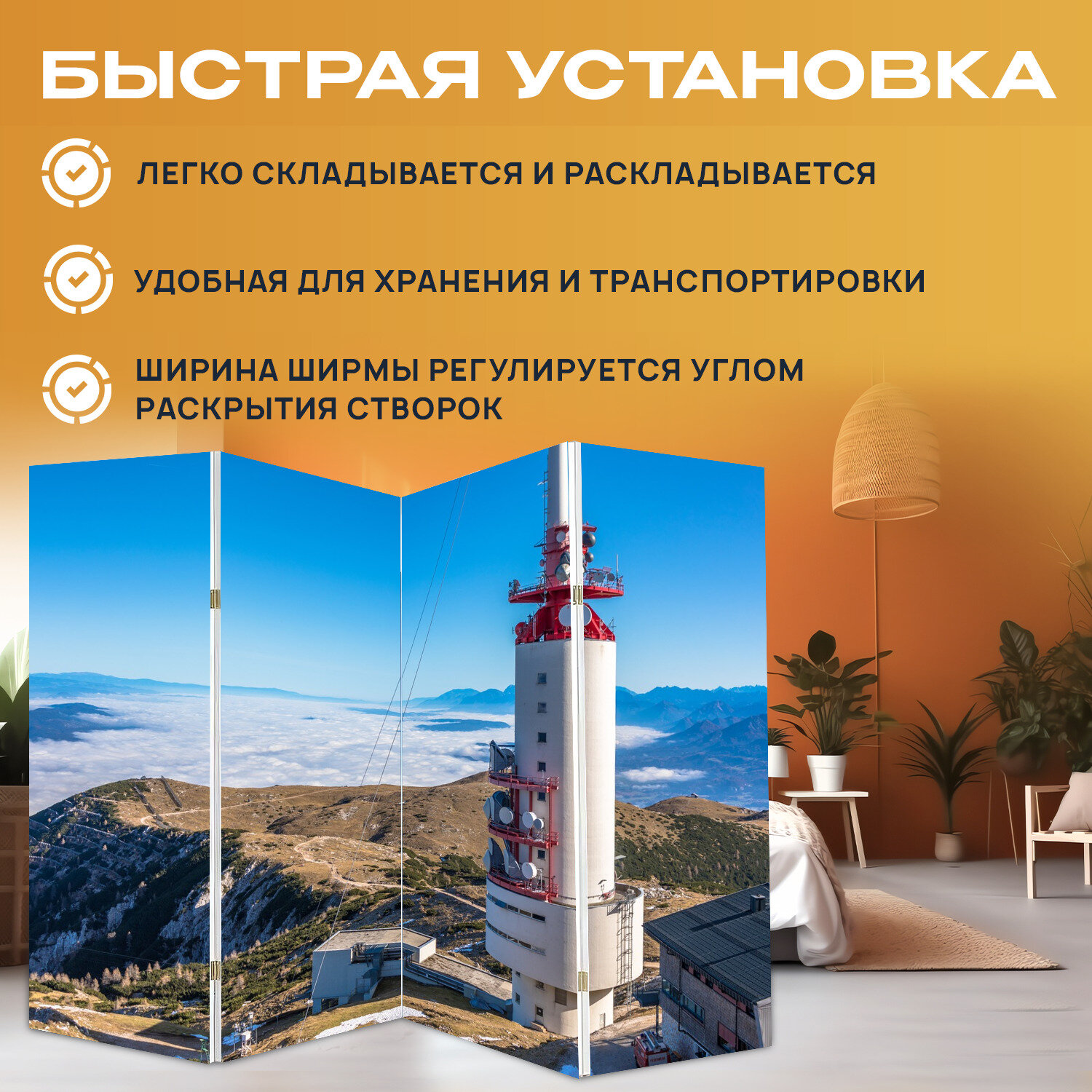 Ширма перегородка с принтом "Гора, саммит, канал" на холсте - 200x160 см. для зонирования, раскладная интересное: