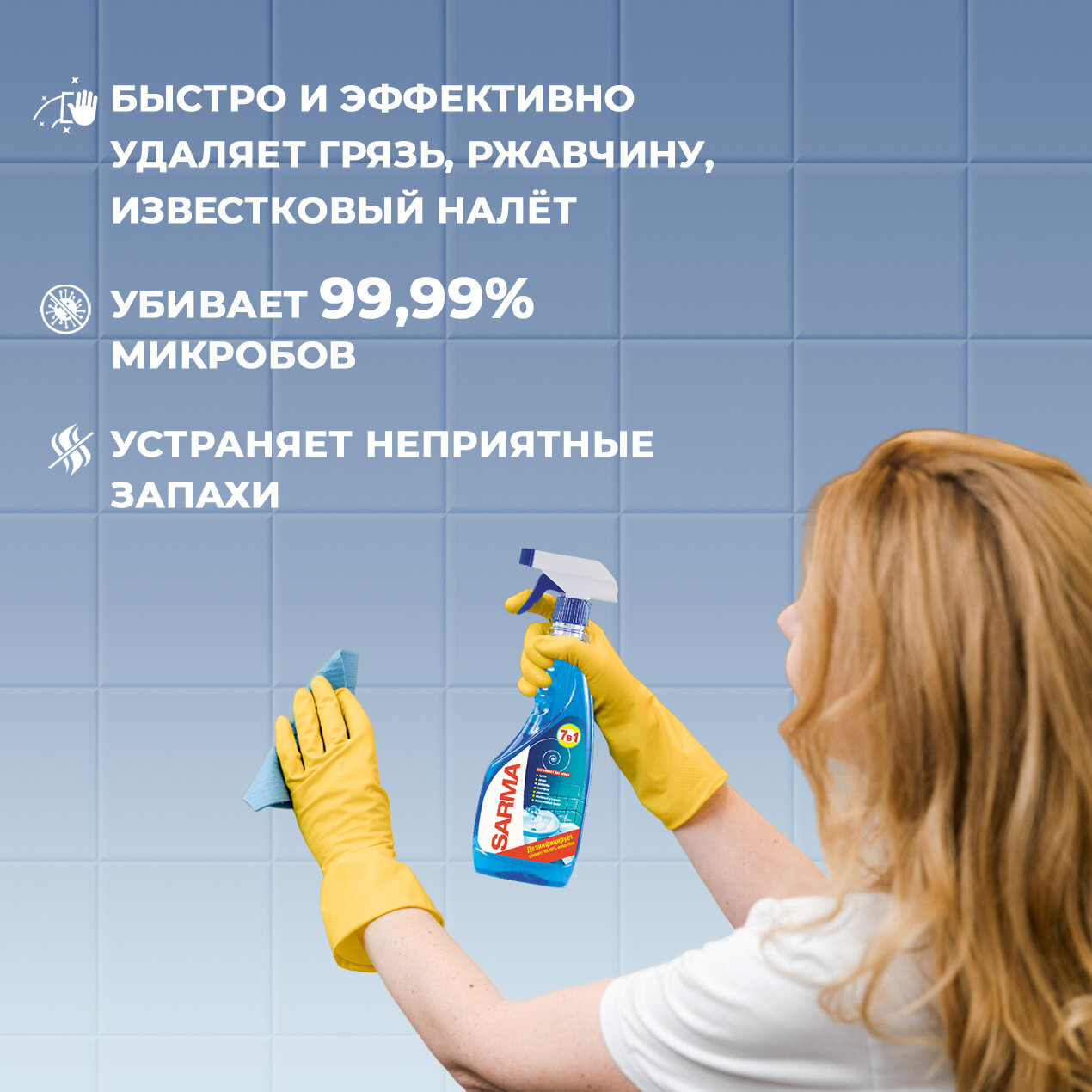 Спрей SARMA для чистки поверхностей ванной 7 в 1 Дезинфицирует удаляет 99,99% микробов 500мл 9080К