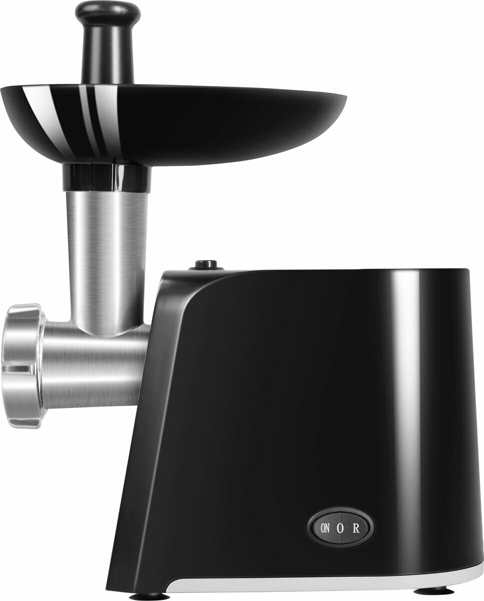 Очень тихая, компактная, красивый дизайн. Есть устройство для заталкивание фарша в комплекте.