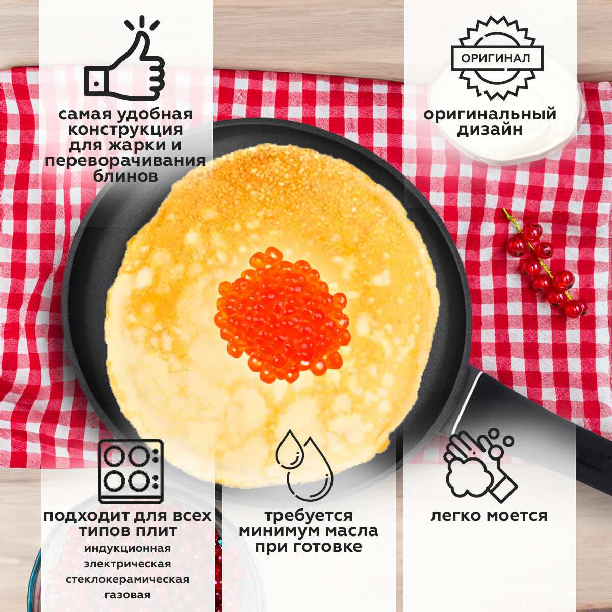| Плюсы: | Легкая, не пригорает. Отлично для блинов и панкейков |