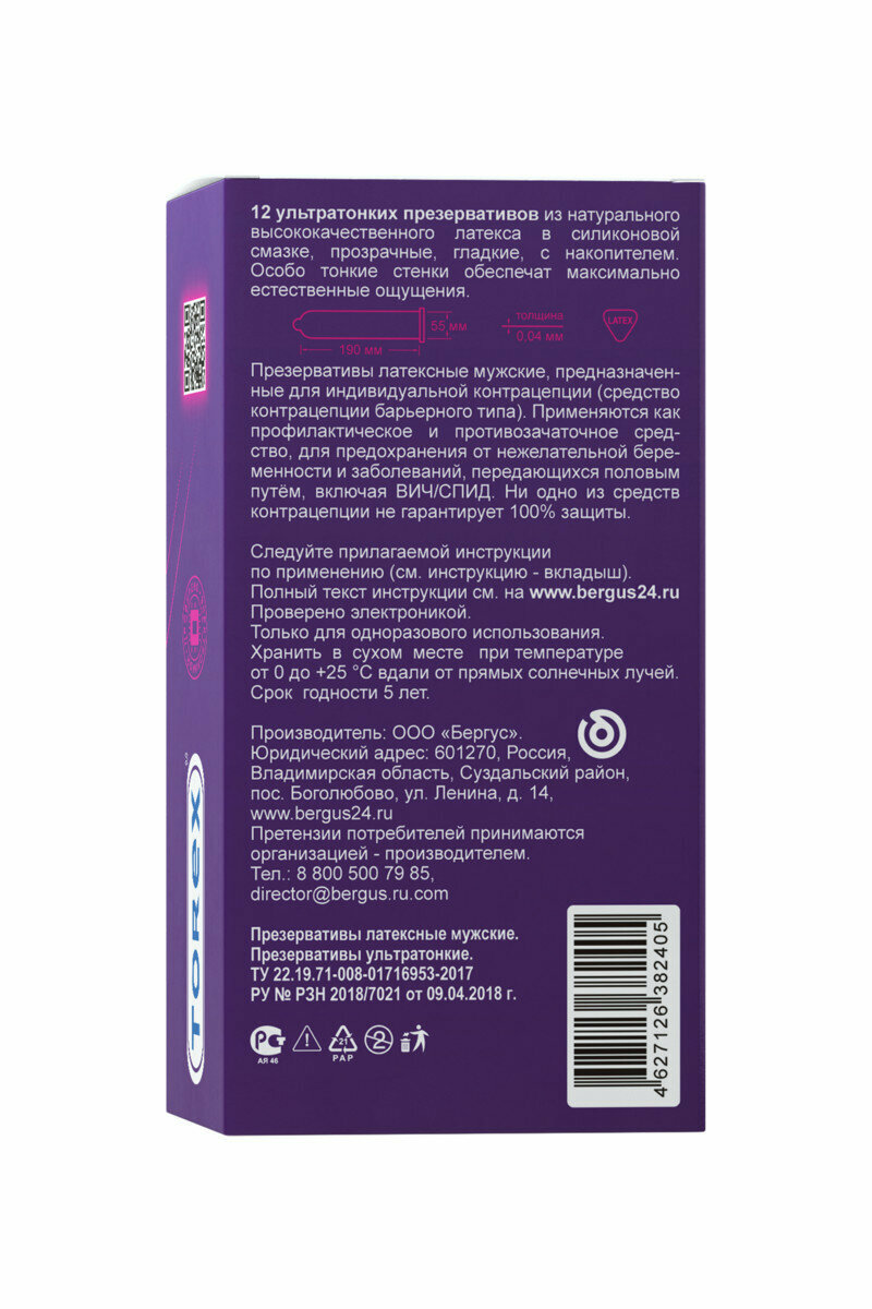 Презервативы ультратонкие TOREX латекс, №12, 19 см