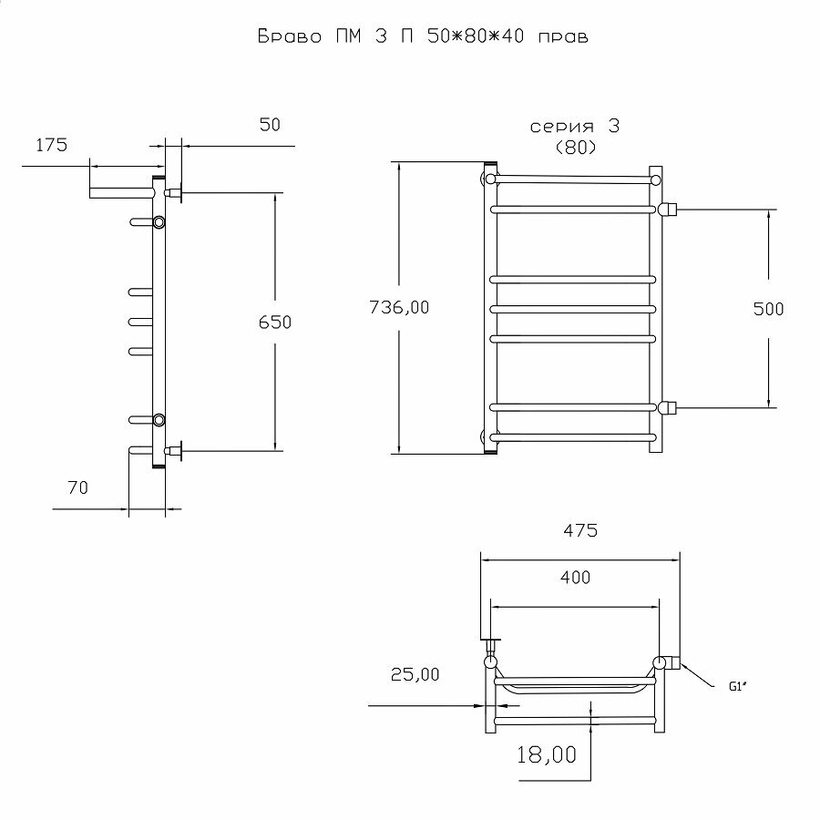 Полотенцесушитель Тругор Браво с полкой ПМ 3 П 50 х 80 х 40 см., водяной Браво3/ПМ508040 П прав