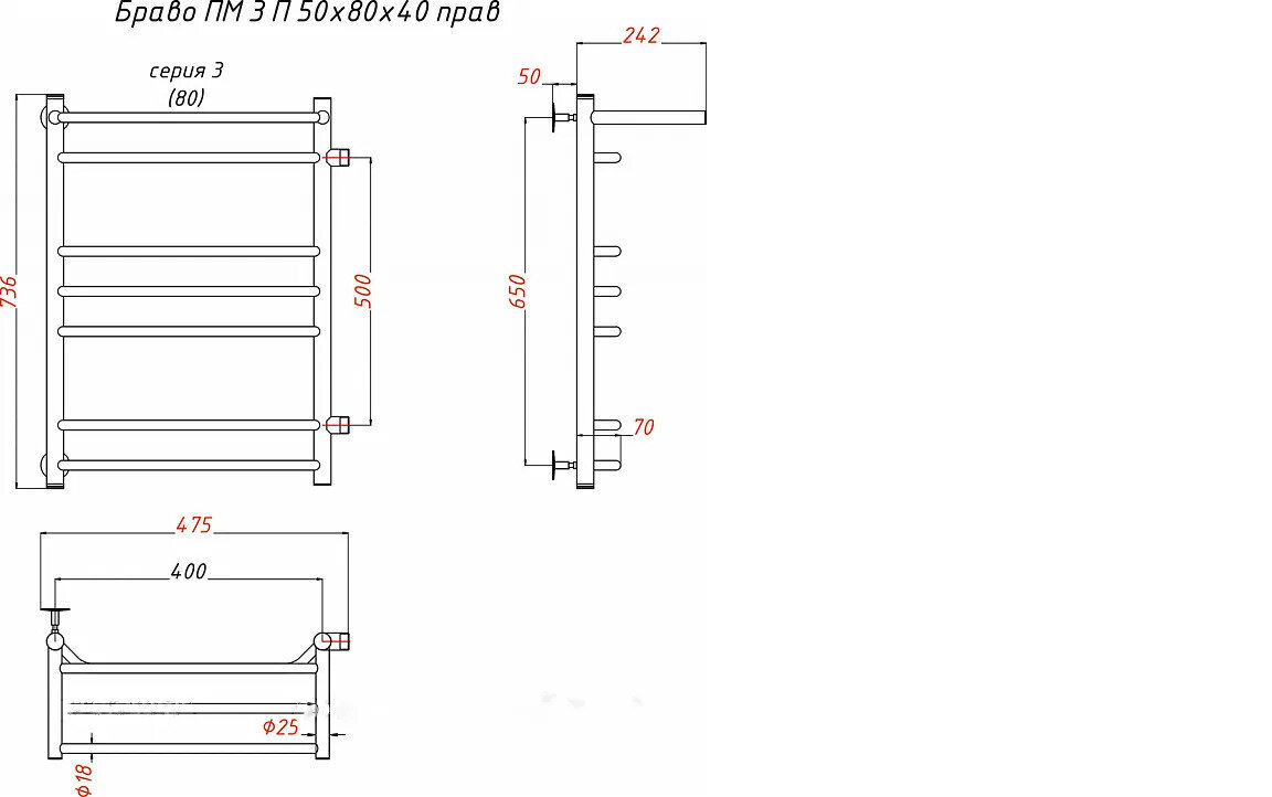 Полотенцесушитель тругор Браво ПМ 3 П 50*80*40 (ЛЦ4) правый Браво3/ПМ508040Пправ