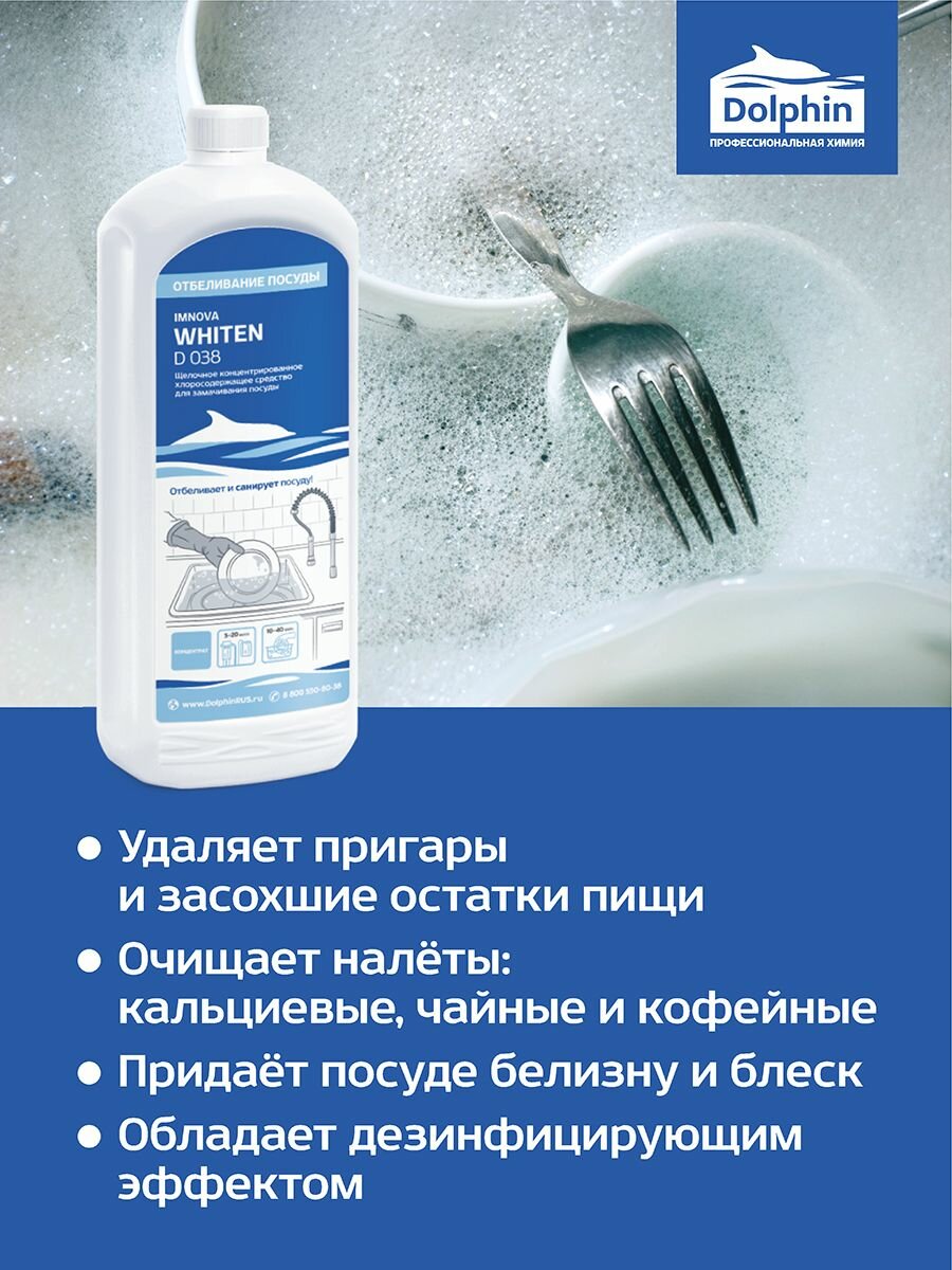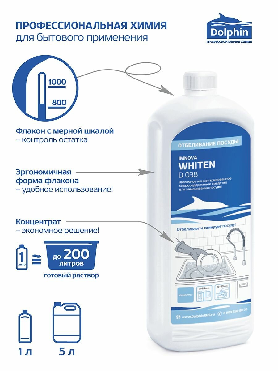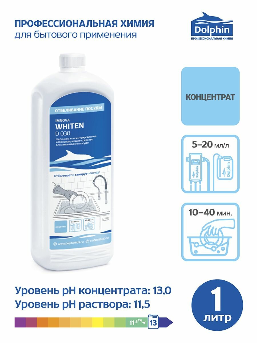 Профхим д/посуды замач/отбел, хлорн. с дез-эфф Dolphin/Imnova WHITEN,1л