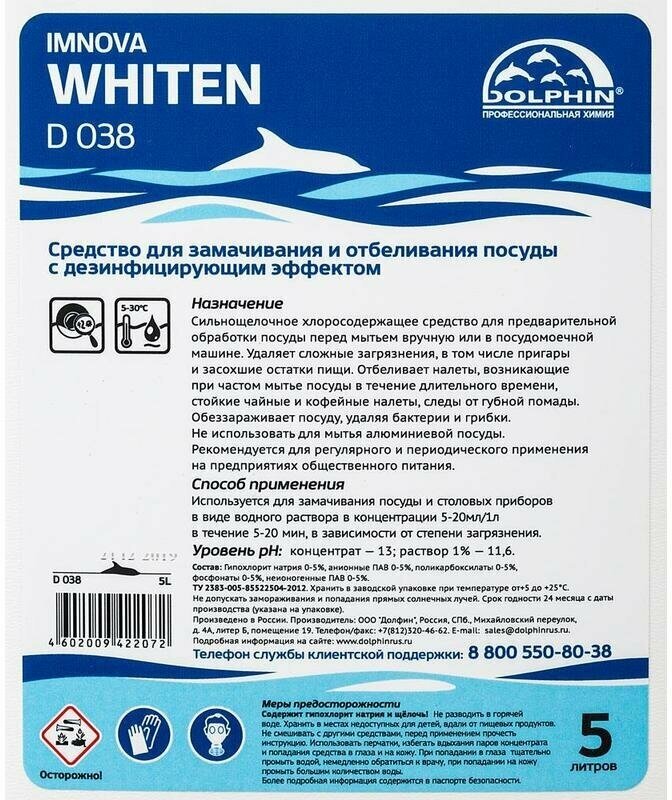 Профхим д/посуды замач/отбел, хлорн. с дез-эфф Dolphin/Imnova WHITEN,5л