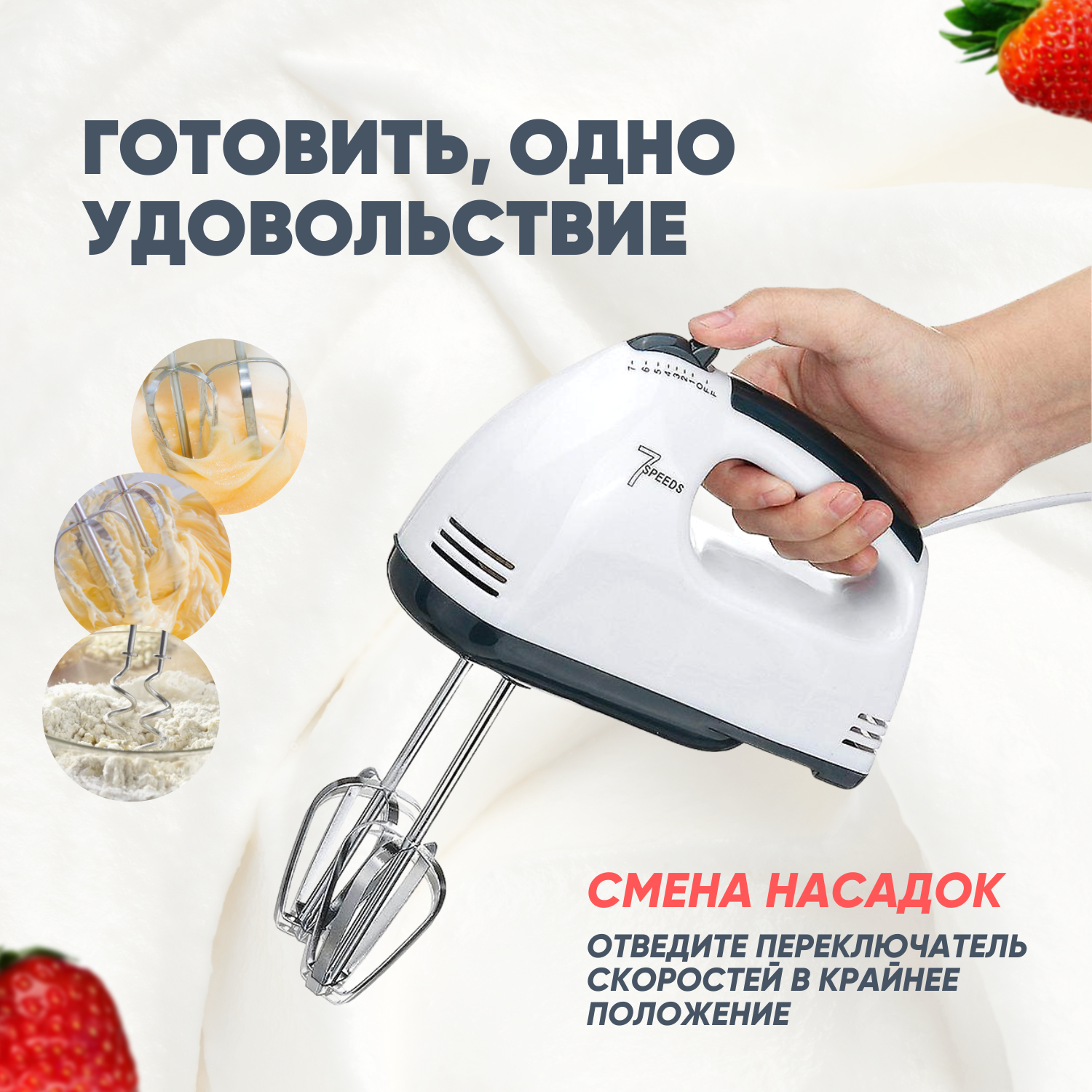 | Отзыв: | Занимаюсь изготовлением тортов на заказ, заказов, миксер незаменимый атрибут для меня в этом деле. Купила я его пару месяцев назад, и каждый день он у меня в работе. И крема им взбиваю, и тесто замешиваю, у него есть 4 насадки для разных действий и 7 скоростей. Отсоединяются насадки от микстов одним щелчком. |