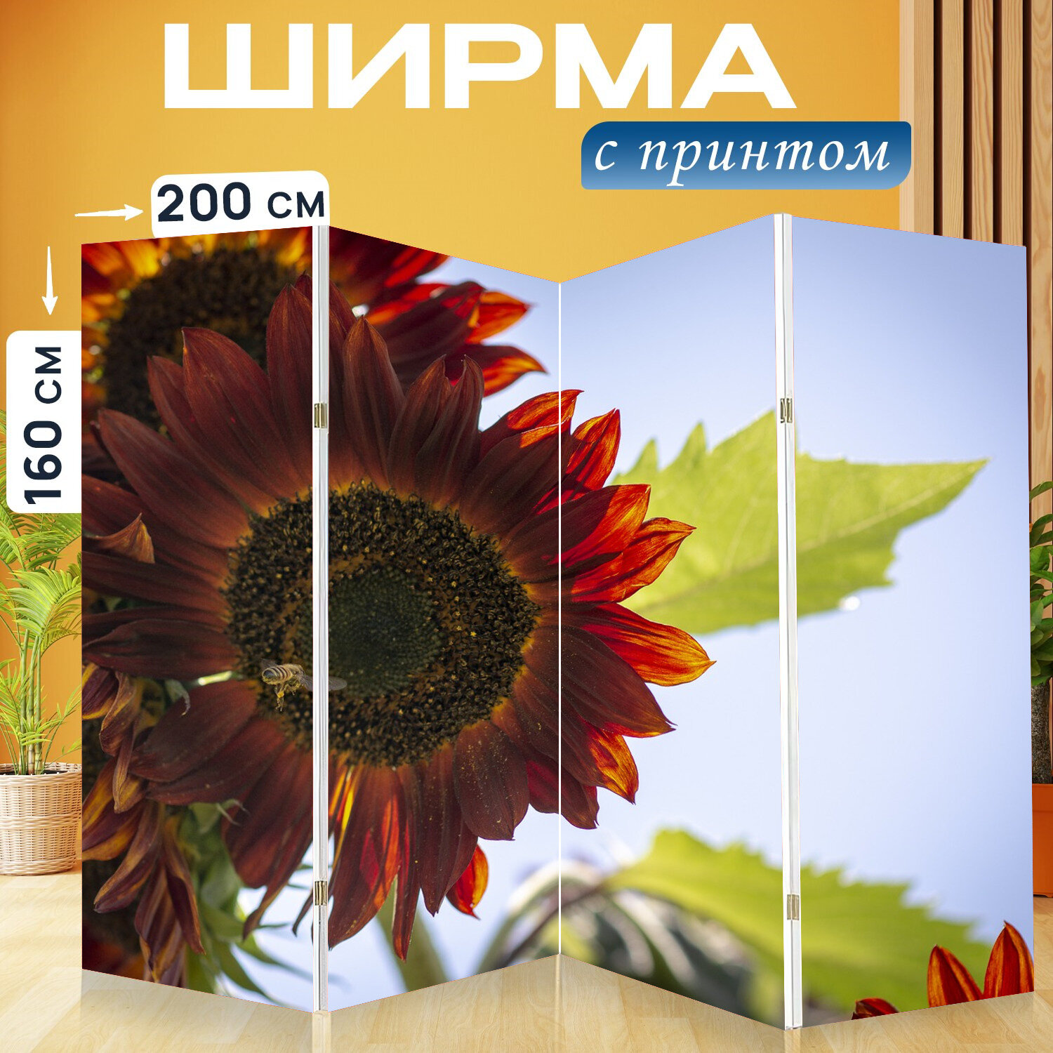 Купить Ширма перегородка с принтом "Подсолнечник, падение, сад" на холсте - 200x160 см. для зонирования, раскладная