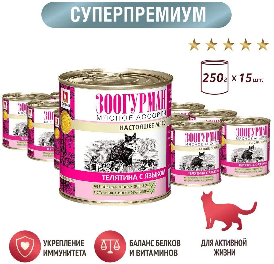 Зоогурман консервы для кошек Мясное ассорти Телятина с языком 250г (15 штук)