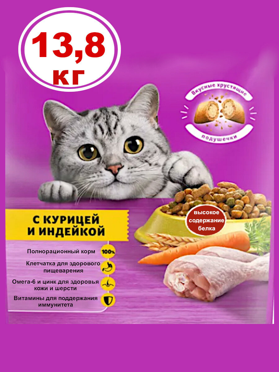 Whiskas Сухой корм Whiskas для кошек, курица/индейка паштет, подушечки, 13,8 кг