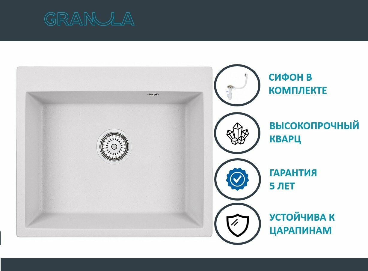 Кухонная мойка кварцевая Granula GR-6001 односекционная квадратная, врезная, чаша 540x410, цвет арктик (6001wh)