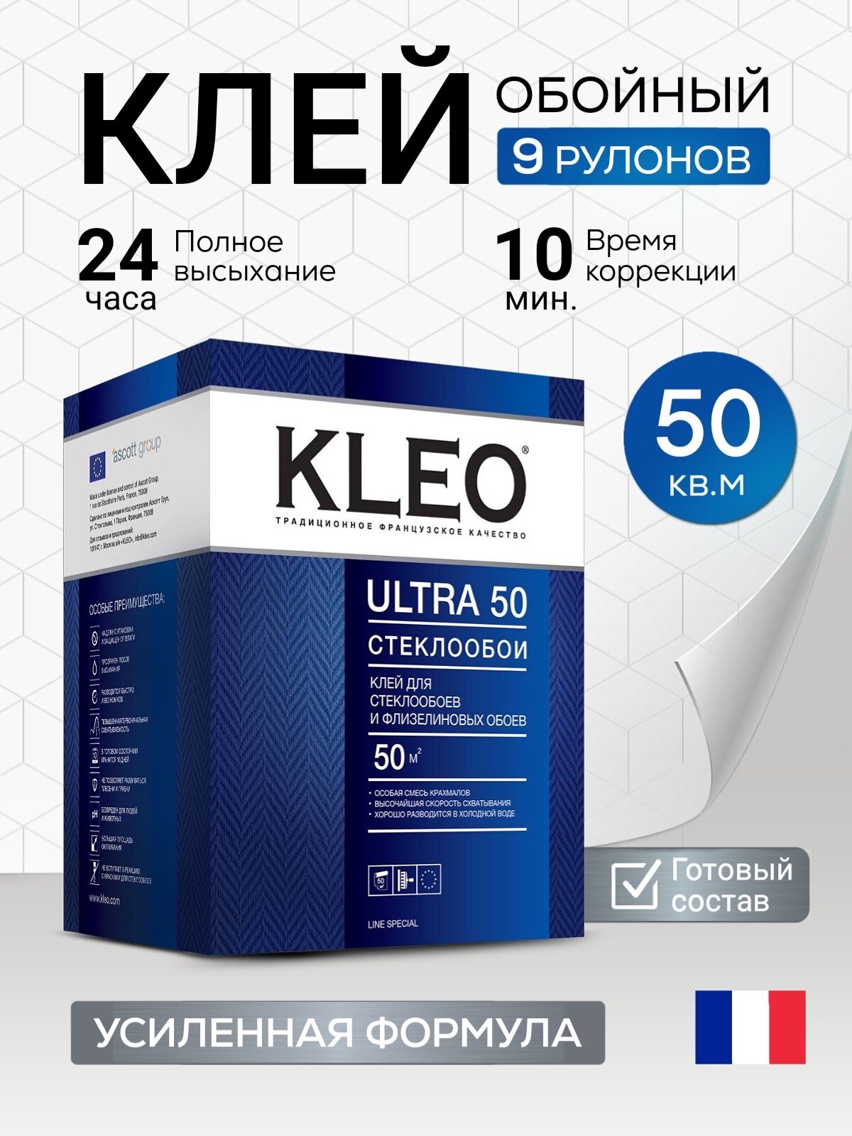Клей для обоев KLEO ULTRA на 50 кв.м, обойный клей для стеклообоев и флизелиновых обоев, сыпучий 500 гр 1шт