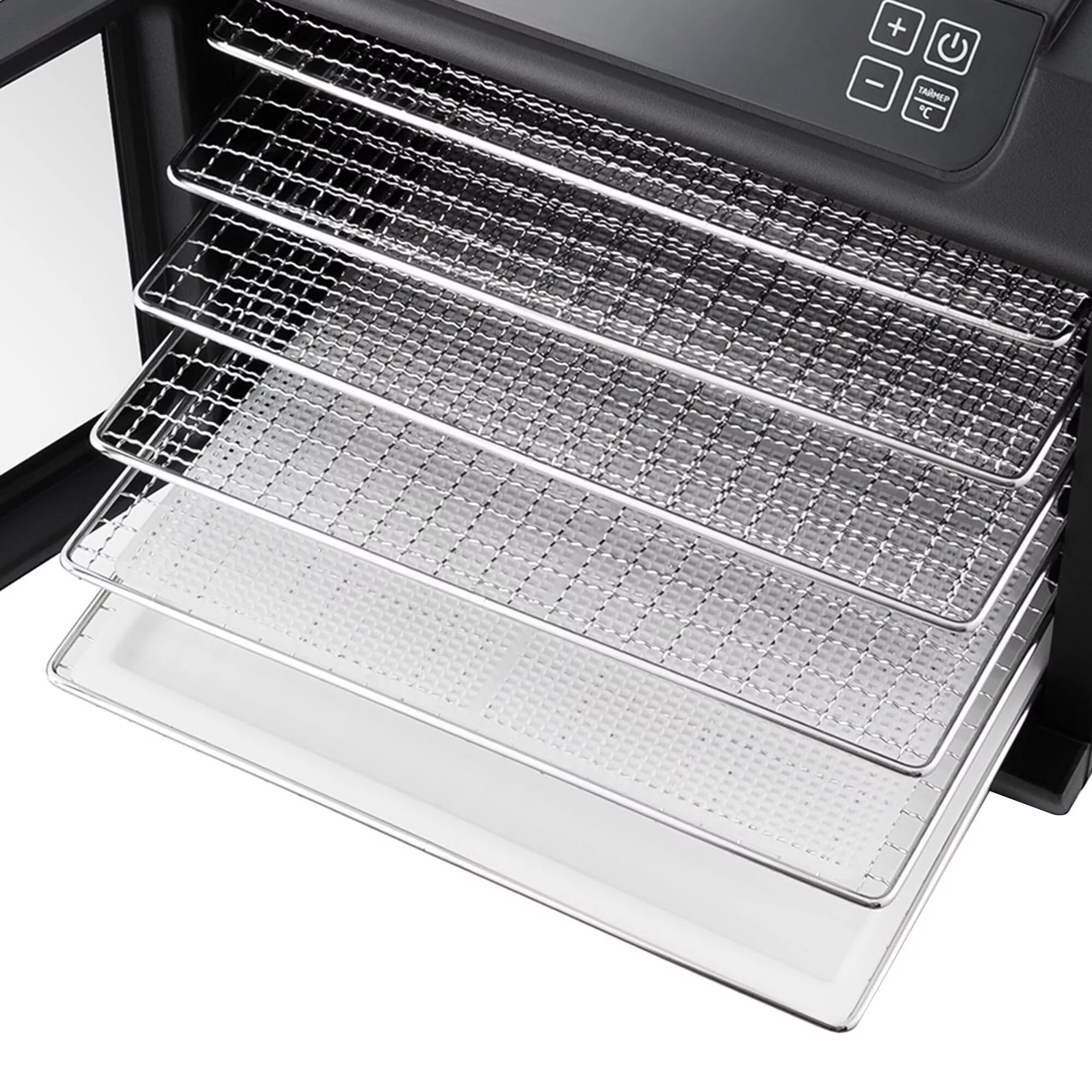 | Плюсы: | Вместительная (6 уровней), хорошая комплектация (6 сеток крупных, 6 мелких - для ягод, например и 6 поддонов для жидкого сырья). Выглядит очень достойно, сенсорное управление удобно при эксплуатации и уходе. Работает тихо. |