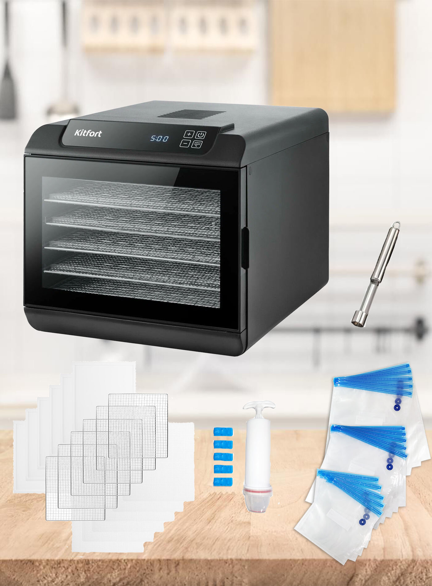 Купить Сушка для овощей Kitfort КТ-1904 и комплект вакуумных пакетов (15 шт.) с насосом и зажимами и нож для вырезания сердцевины яблок!