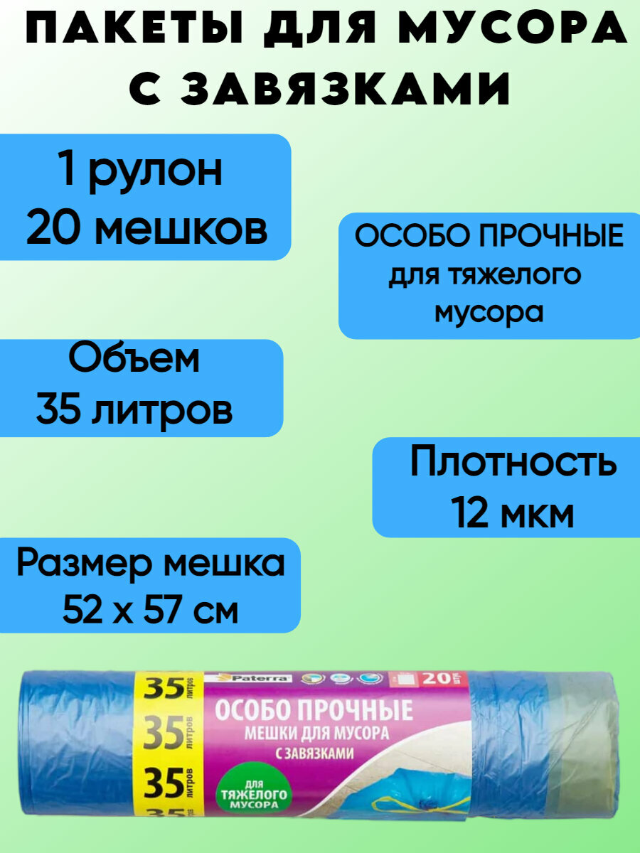 Пакеты для мусора 35 литров "особо прочные" 12 мкм, с завязками 20 штук в рулоне Paterra