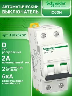 Выключатель автоматический модульный 2п C 2А 6кА iC60N Acti9 SchE, SCHNEIDER ELECTRIC A9F74202 (1 шт.)