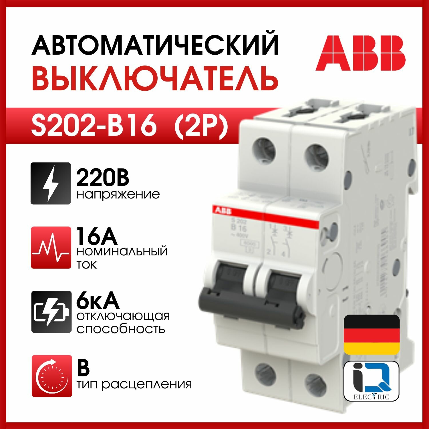 Автоматический выключатель 2п (2P) 16А тип B 6кА S202 ABB 2CDS252001R0165 1шт