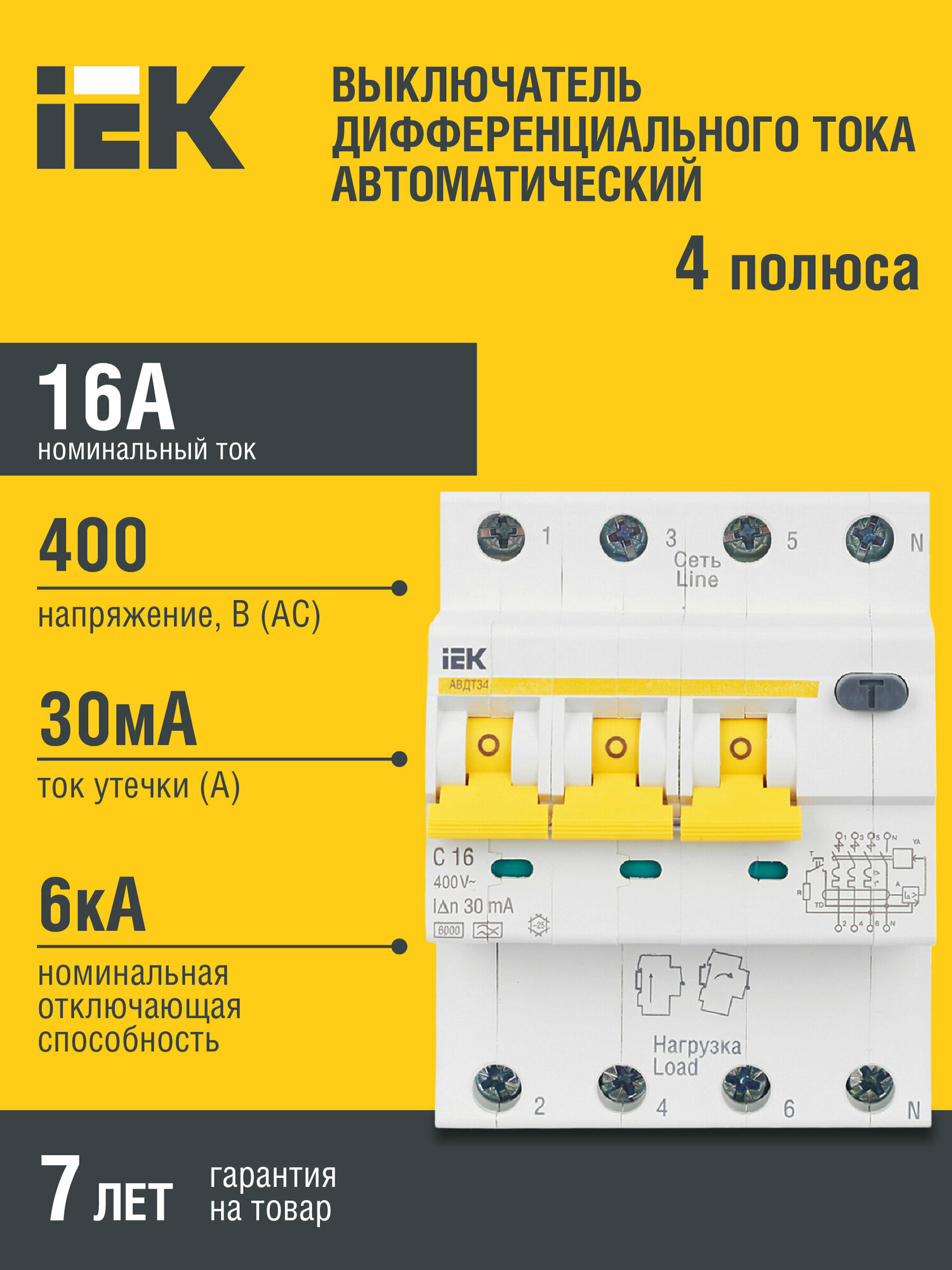Дифференциальный автомат IEK АВДТ 34 4П 30 мА C 6 кА A электромеханический 16 А