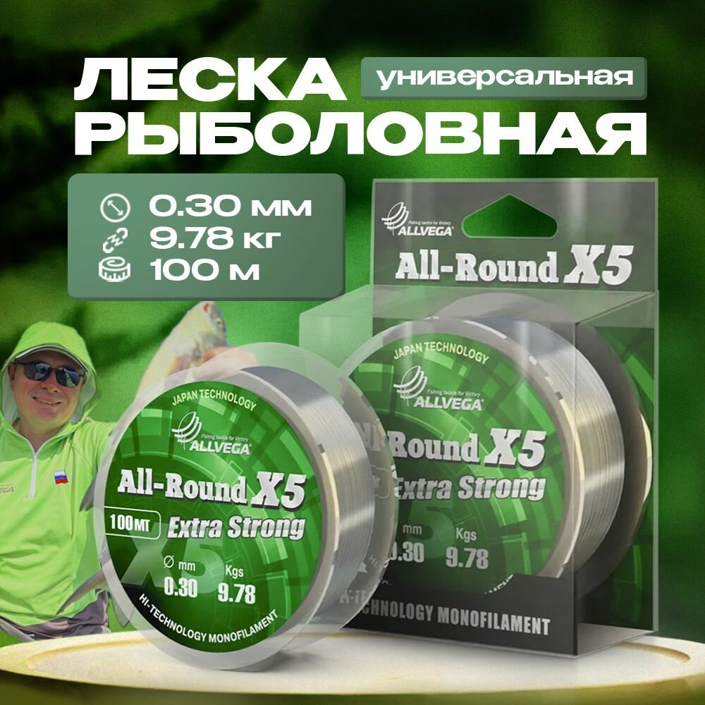 Леска монофильная ALLVEGA "ALL-ROUND X5" 0.30мм (100м) (9,78кг) (прозрачная)
