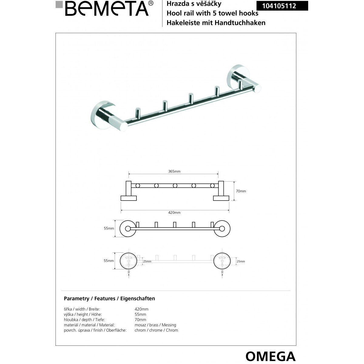 5 крючков на планке Bemeta OMEGA 104105112