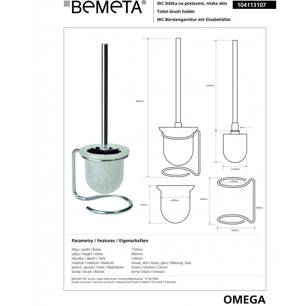 Настенный ёршик Bemeta Оmega, арт. 104113017, хром, стекло, черная щётка