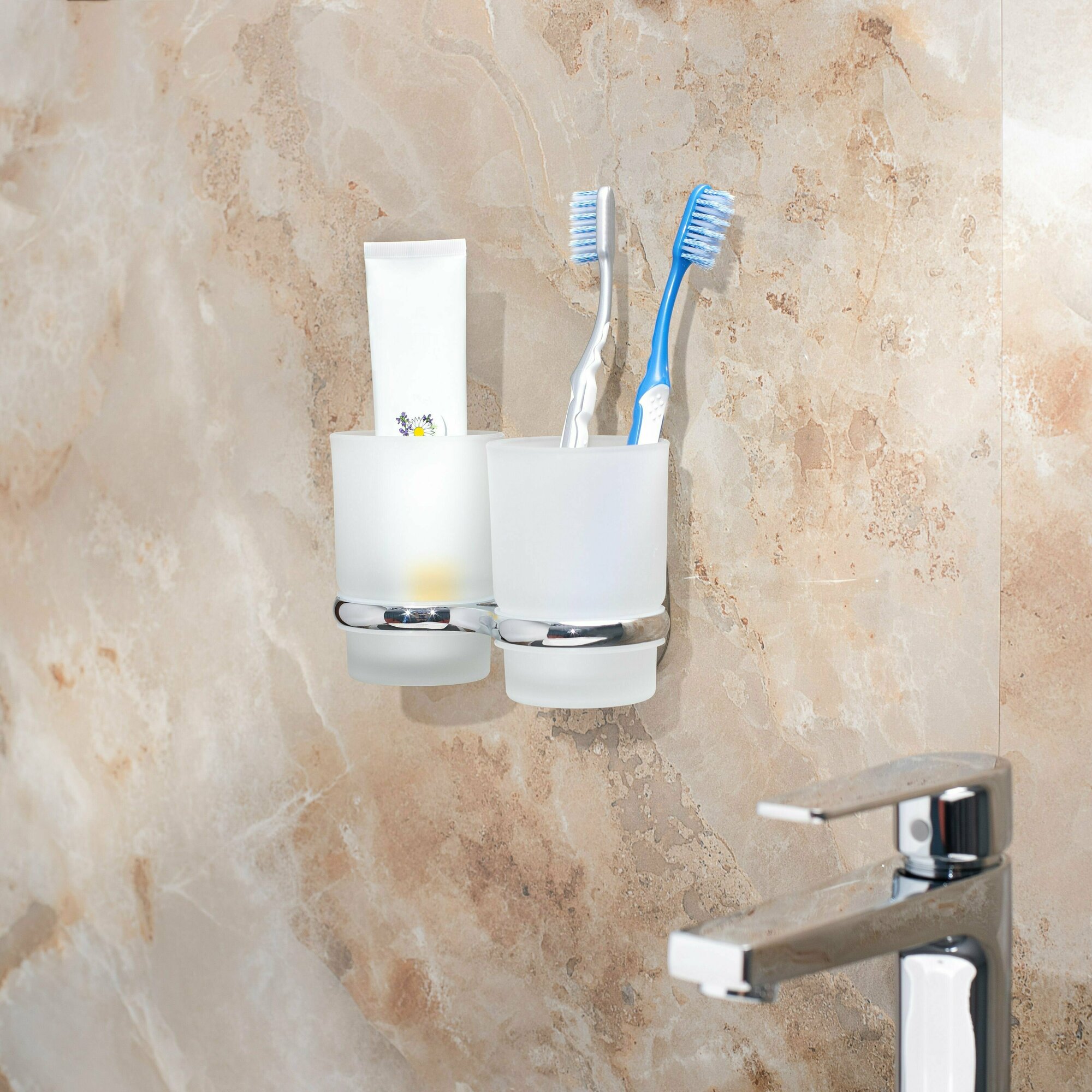 Стакан для зубных щеток, РМС A6021, двойной, настенный, стекло, держатель из нержавеющей стали, хром, гарантия интересное: