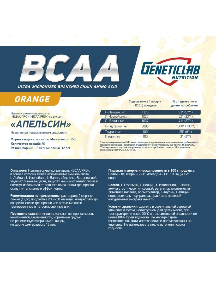 Bcaa PRO Genetic LAB 250 г (Апельсин)