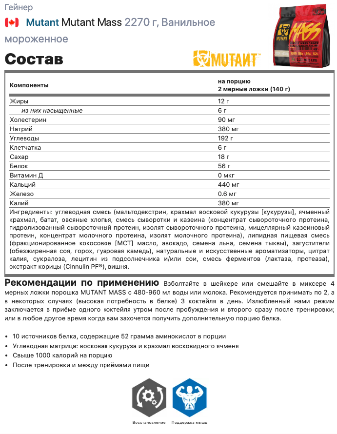 | Отзыв: | Отличный состав для набора массы. |