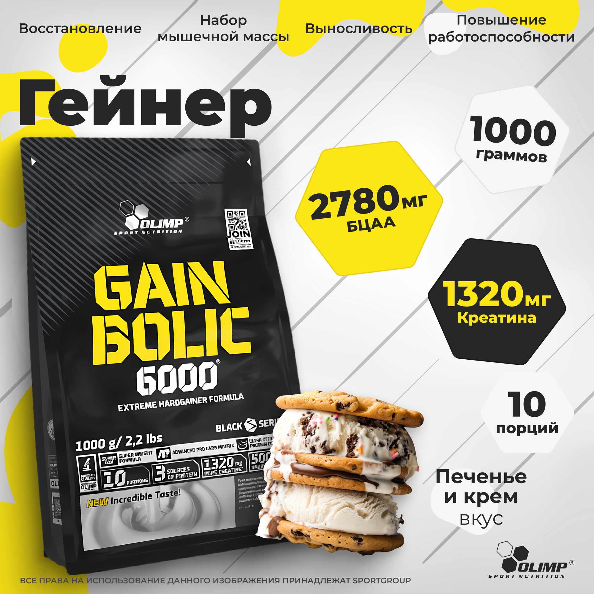 Гейнер для набора массы Olimp Gain Bolic 6000, 1000 гр., 10 порций, печенье и крем / спортивное питание для роста мышечной массы