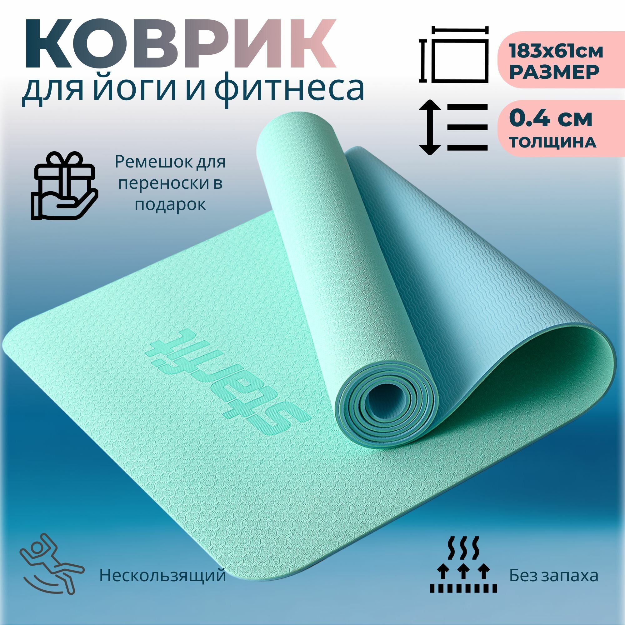 СохранитьКоврик для йоги и фитнеса STARFIT FM-201, TPE, 183x61x0,4 см, мятный/синий с шнурком для переноски интересное: