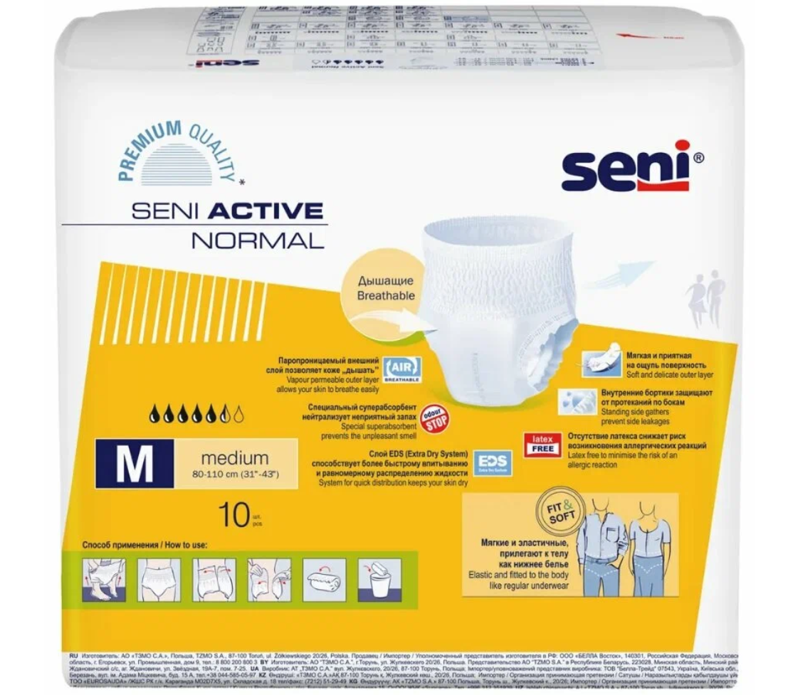 Трусы впитывающие SENI ACTIVE NORMAL Medium по 10 шт., обхват 80-110 см.