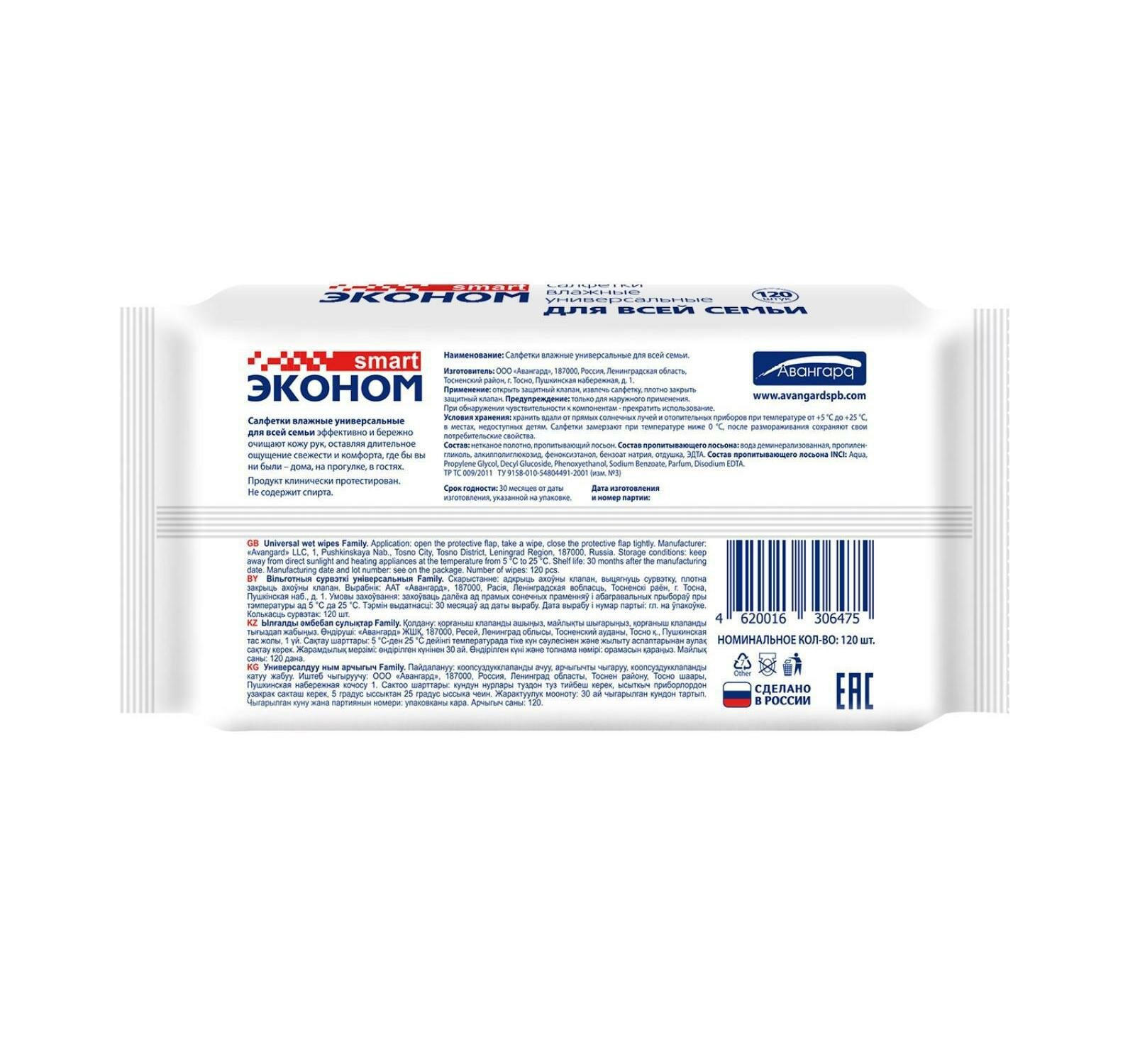Влажные салфетки авангард эконом Smart, 120 шт, для всей семьи, с пластиковым клапаном