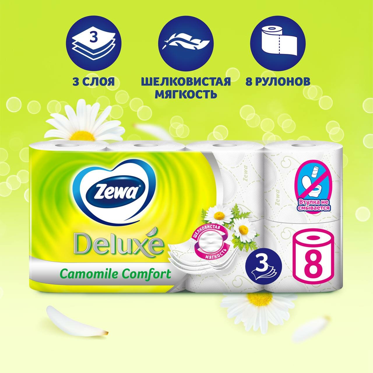 СохранитьТуалетная бумага ZEWA Делюкс Ромашка 3-х слойная 8 шт интересное: