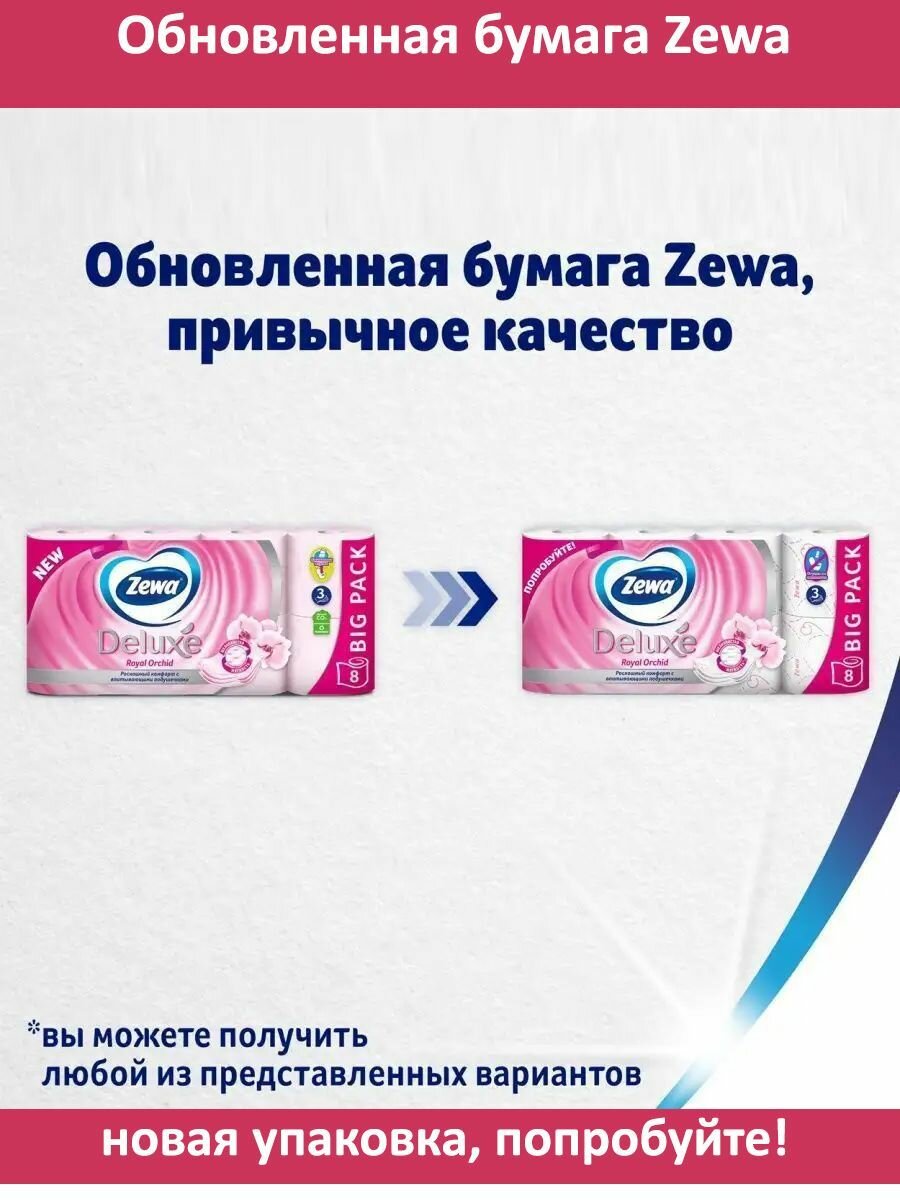 Купить Туалетная бумага Zewa Deluxe Royal Orchid с впитывающими подушечками, с тиснением и перфорацией, цвет белая, с цветным рисунком, аромат орхидеи, 3 слоя, 8 рулонов