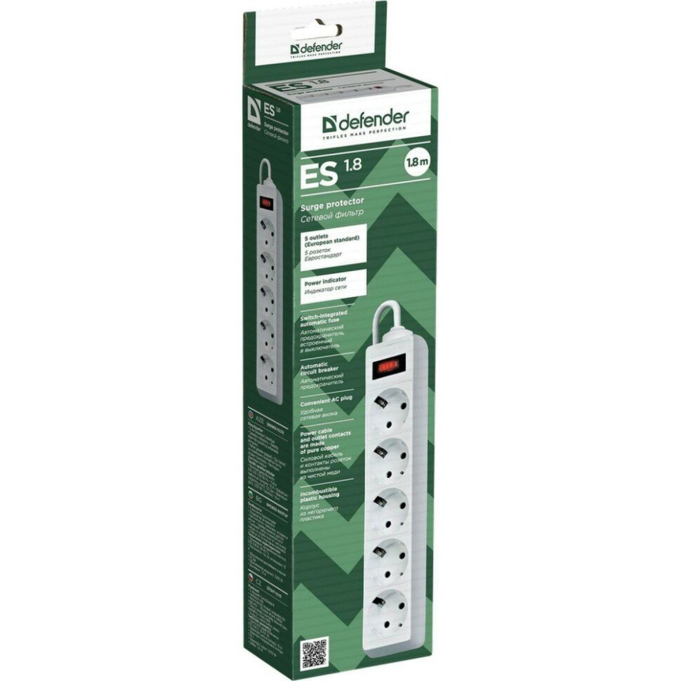 Сетевой фильтр DEFENDER ES 1.8 (1.8 м, белый, 5 розеток)