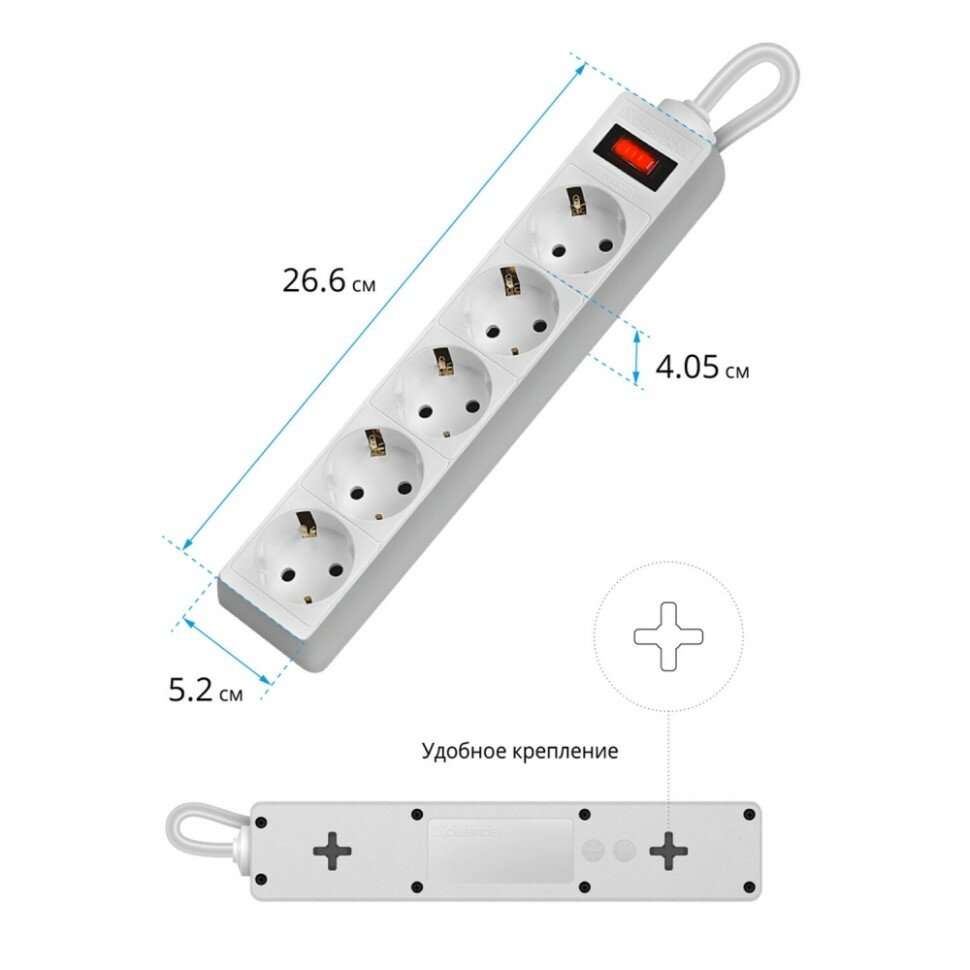 Сетевой фильтр Defender ES, 5 розеток, белый, шнур 1, 8 м (99481)