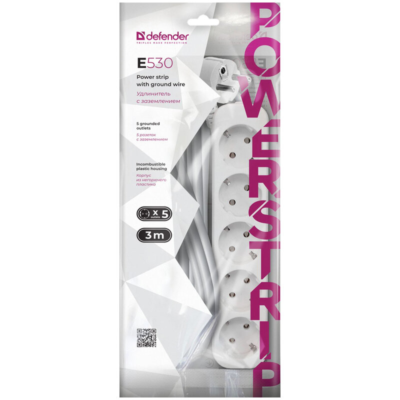 Удлинитель Defender E530, 5 розеток, с заземлением, 3м, белый ( Артикул 262240 )