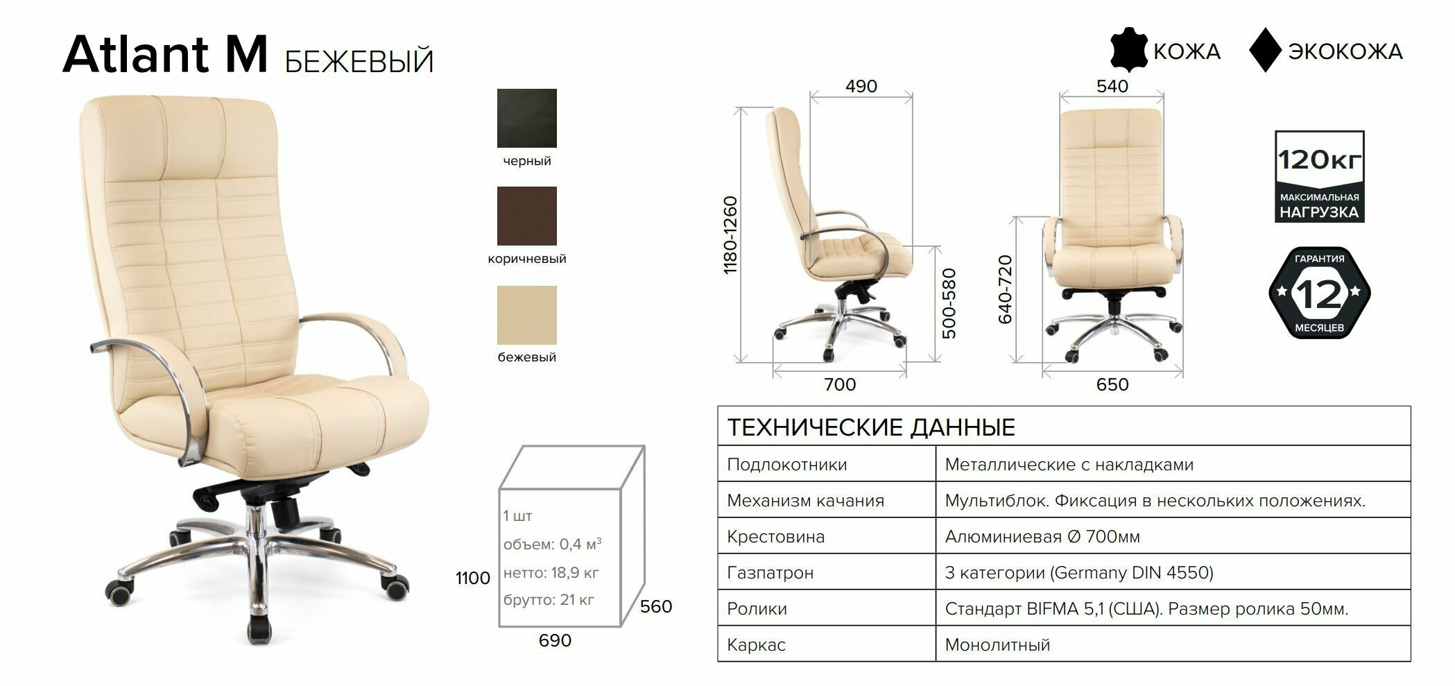 Кресло руководителя Everprof Atlant AL M кожа макс. нагрузка 120 кг, поясничная поддержка, удобный подголовник, ролики для паркета бежевый