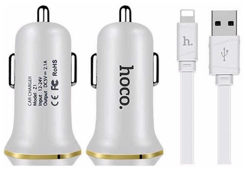 Автомобильное зарядное устройство Hoco Z1 White зарядка 2.1А 2 USB-порта + кабель Lightning - белый