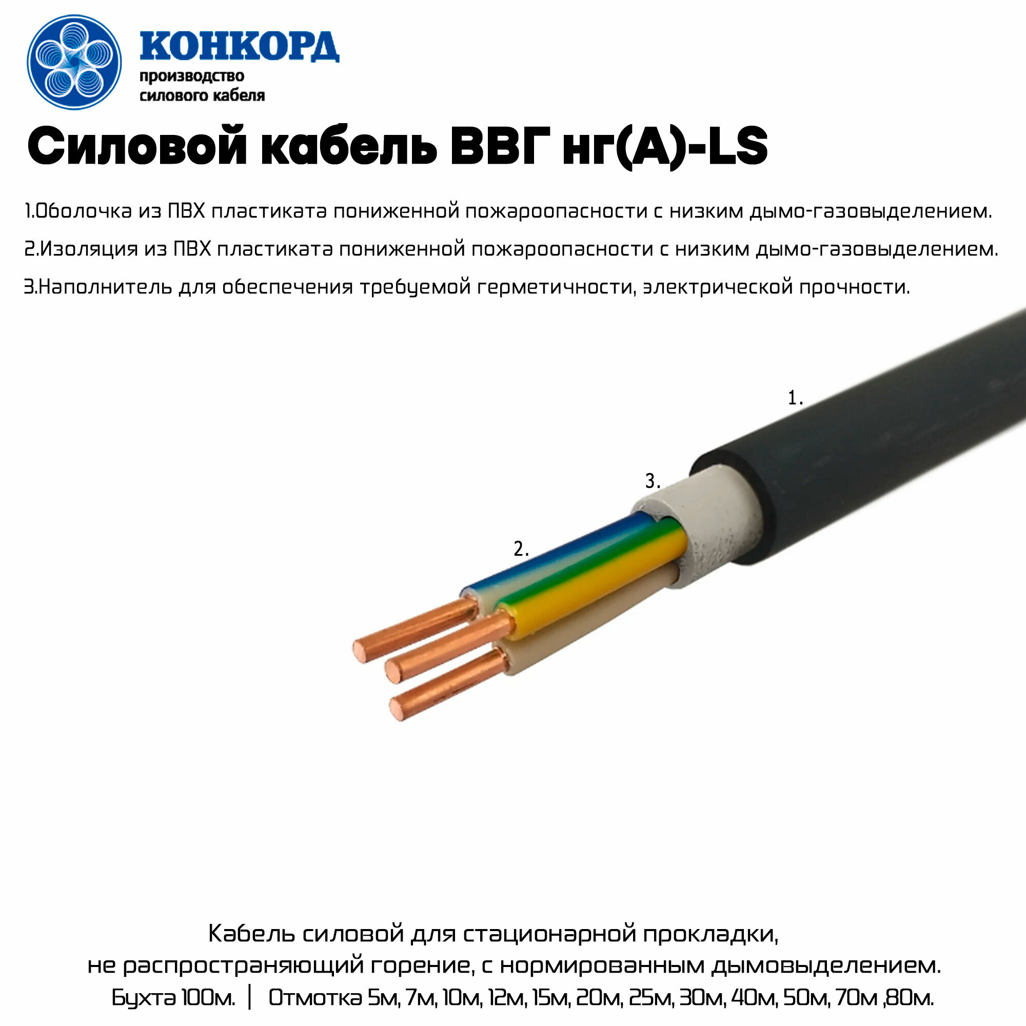 Силовой кабель ВВГнг(A)-LS 3х1.5 10метров Конкорд ГОСТ