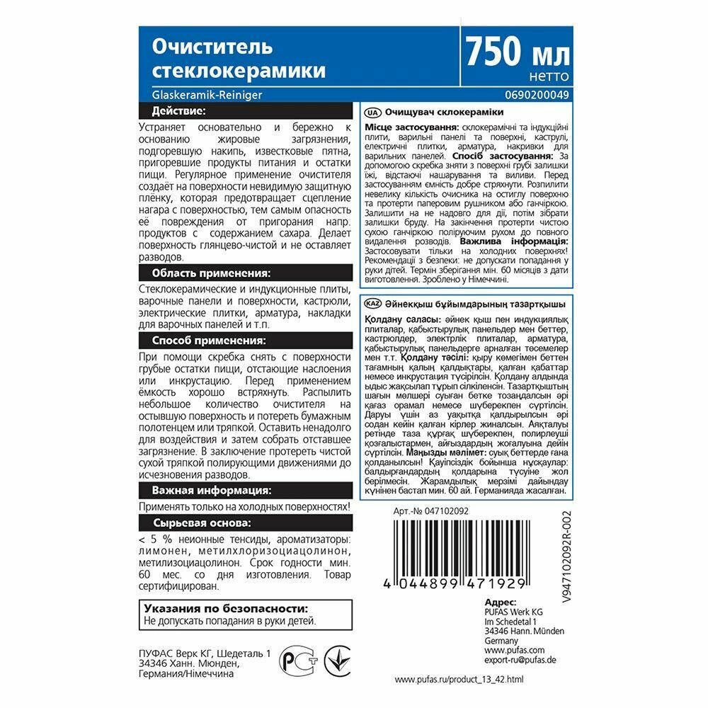 Очиститель стеклокерамики, Pufas Glutoclean Glaskeramik Reiniger, 750 мл. интересное: