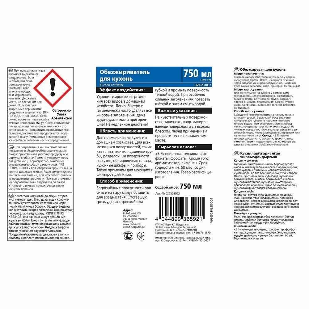 PUFAS Glutoclean Обезжириватель для кухонь, 750 мл