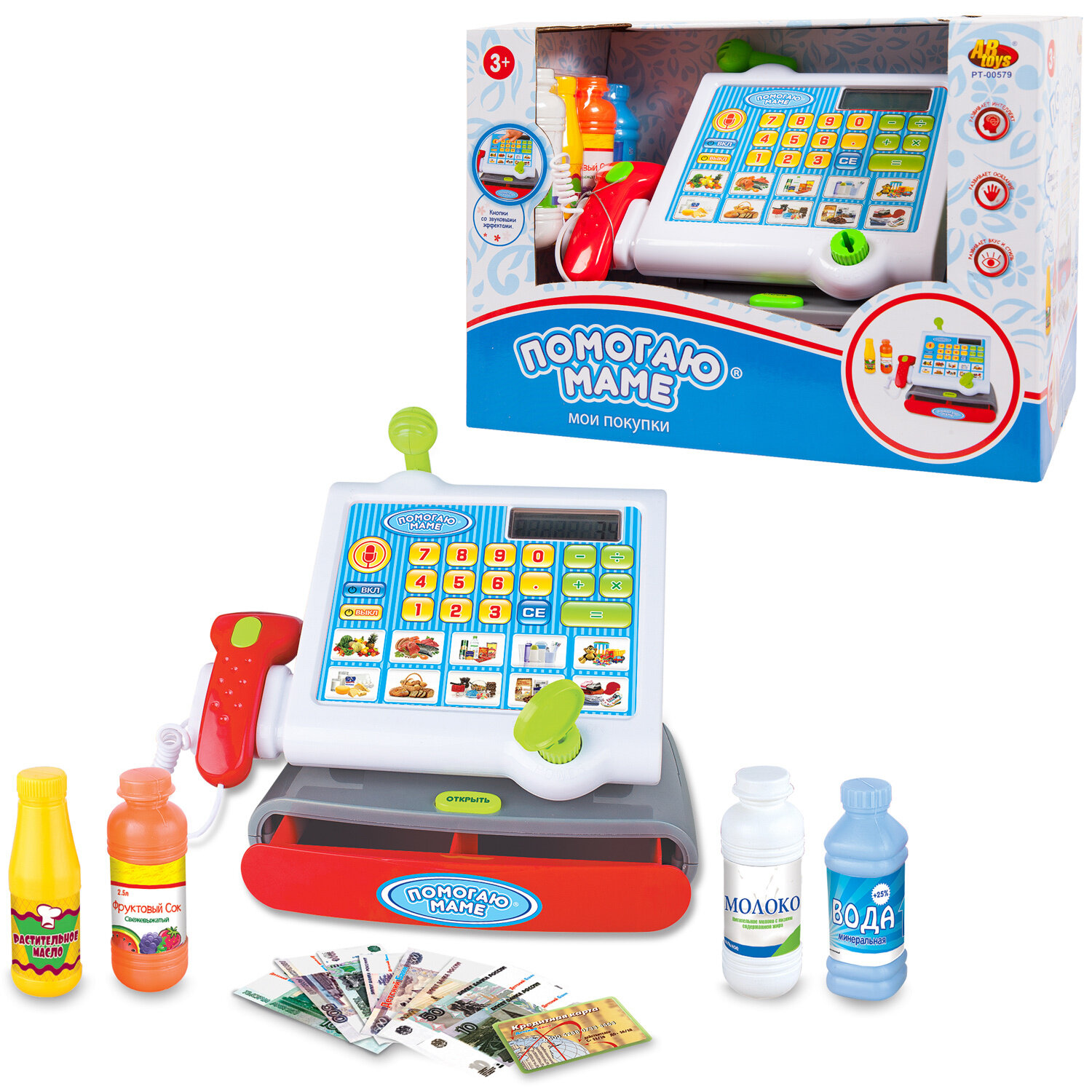 Касса "Помогаю Маме", в наборе с продуктами, на батарейках, 13 предметов, с эффектами PT-00579