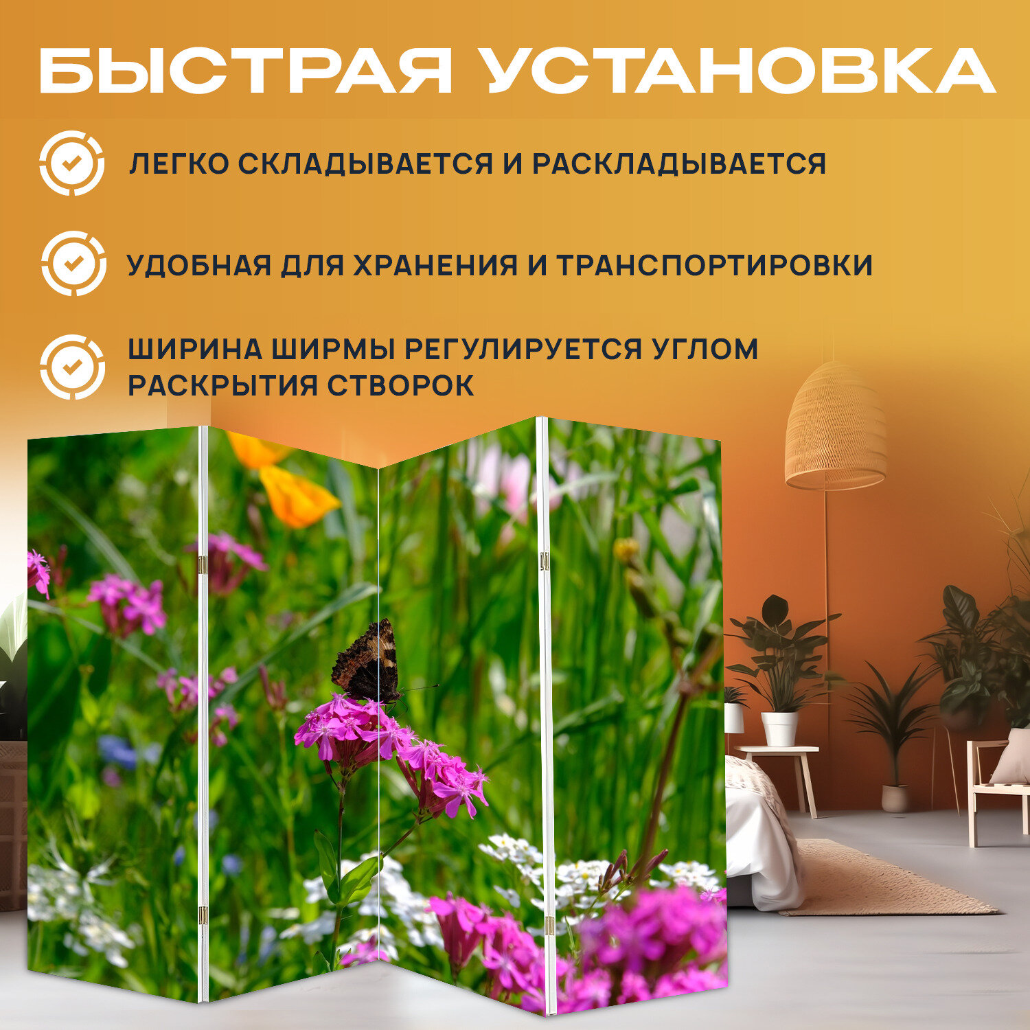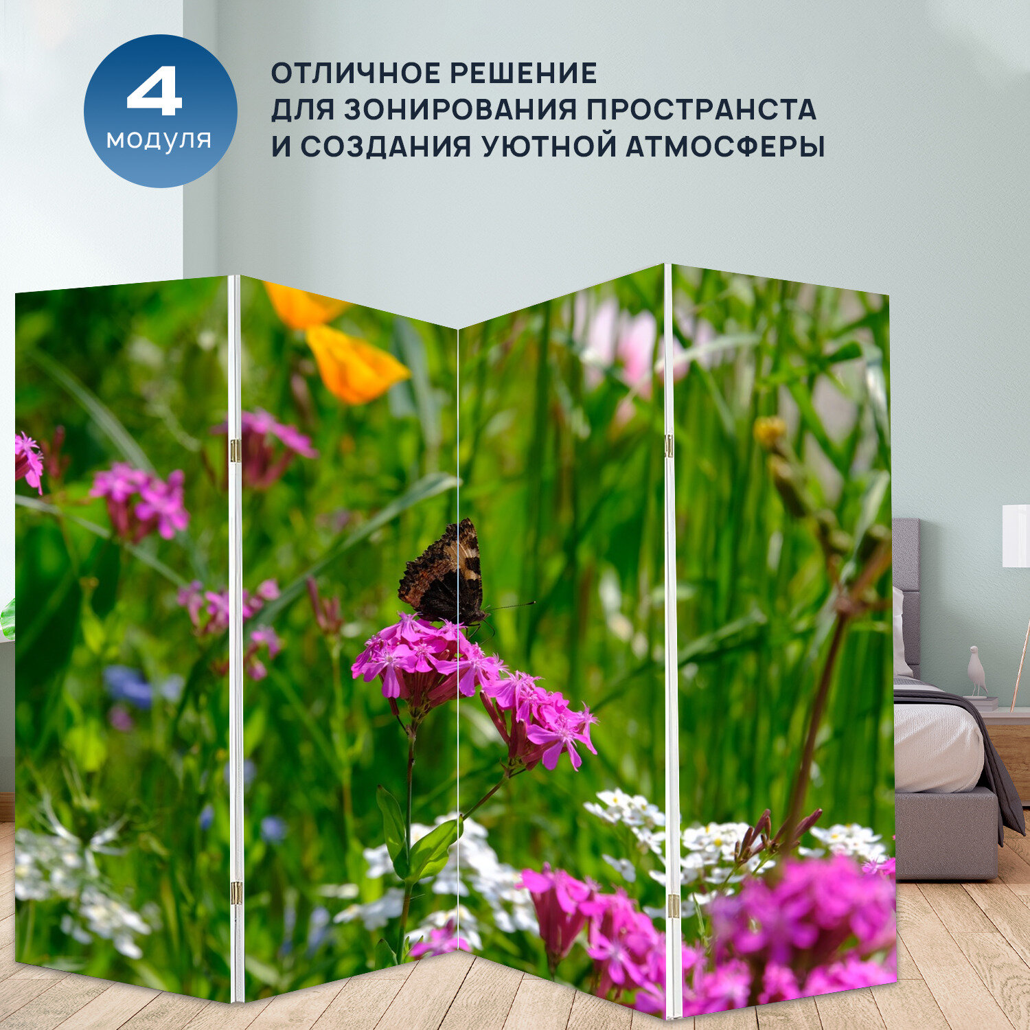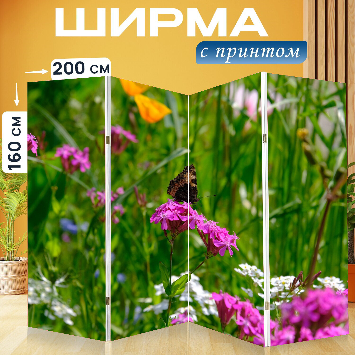 Купить Ширма перегородка с принтом "Цветок, бабочка, кумба" на холсте - 200x160 см. для зонирования, раскладная