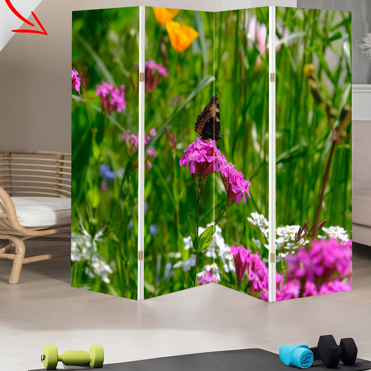 Ширма перегородка с принтом "Цветок, бабочка, кумба" на холсте - 200x160 см. для зонирования, раскладная интересное: