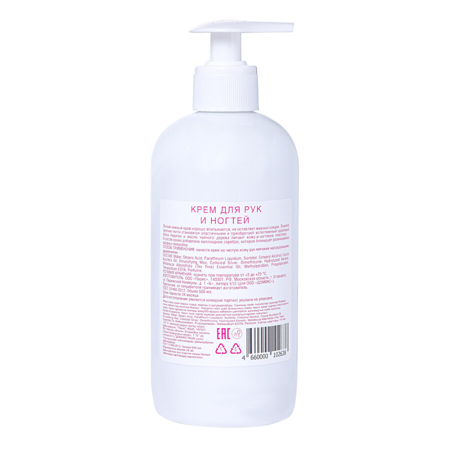 Крем для рук и ногтей с кератином, маслом чайного дерева и серебром, 500 мл