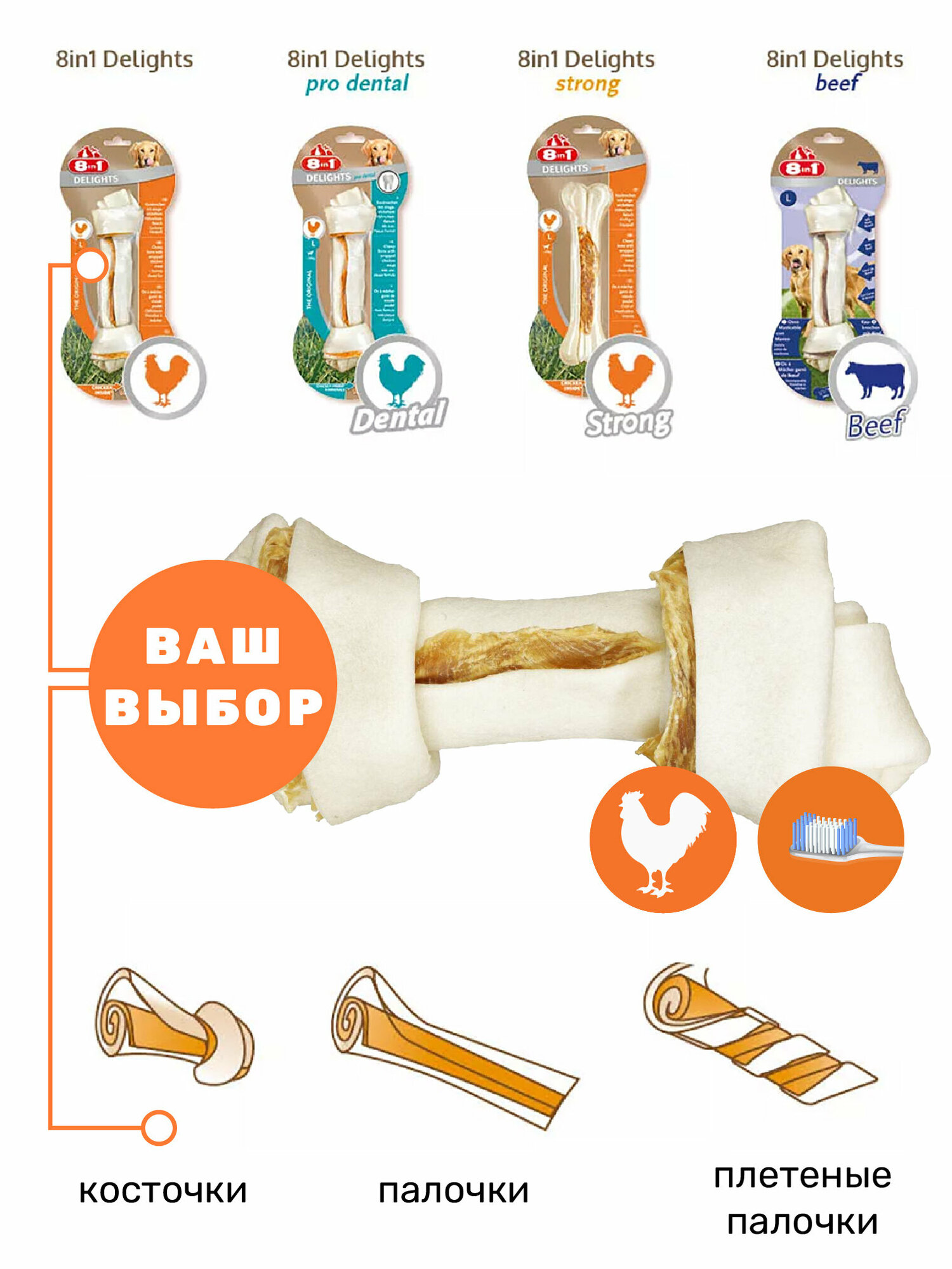 Ниже Вы можете прочитать отзывы на Косточка 8in1 Delights для собак, с куриным мясом в жесткой говяжьей коже, M (14,5 см), 1 шт., ознакомится с подробными характеристиками, посмотреть интересные обзоры и фотографии на Косточка 8in1 Delights для собак, с куриным мясом в жесткой говяжьей коже, M (14,5 см), 1 шт..