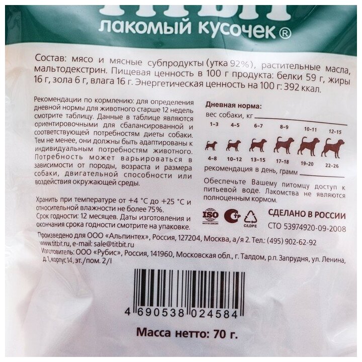 Купить Лакомство для собак Titbit Нарезка утиная для собак мини пород 70 г