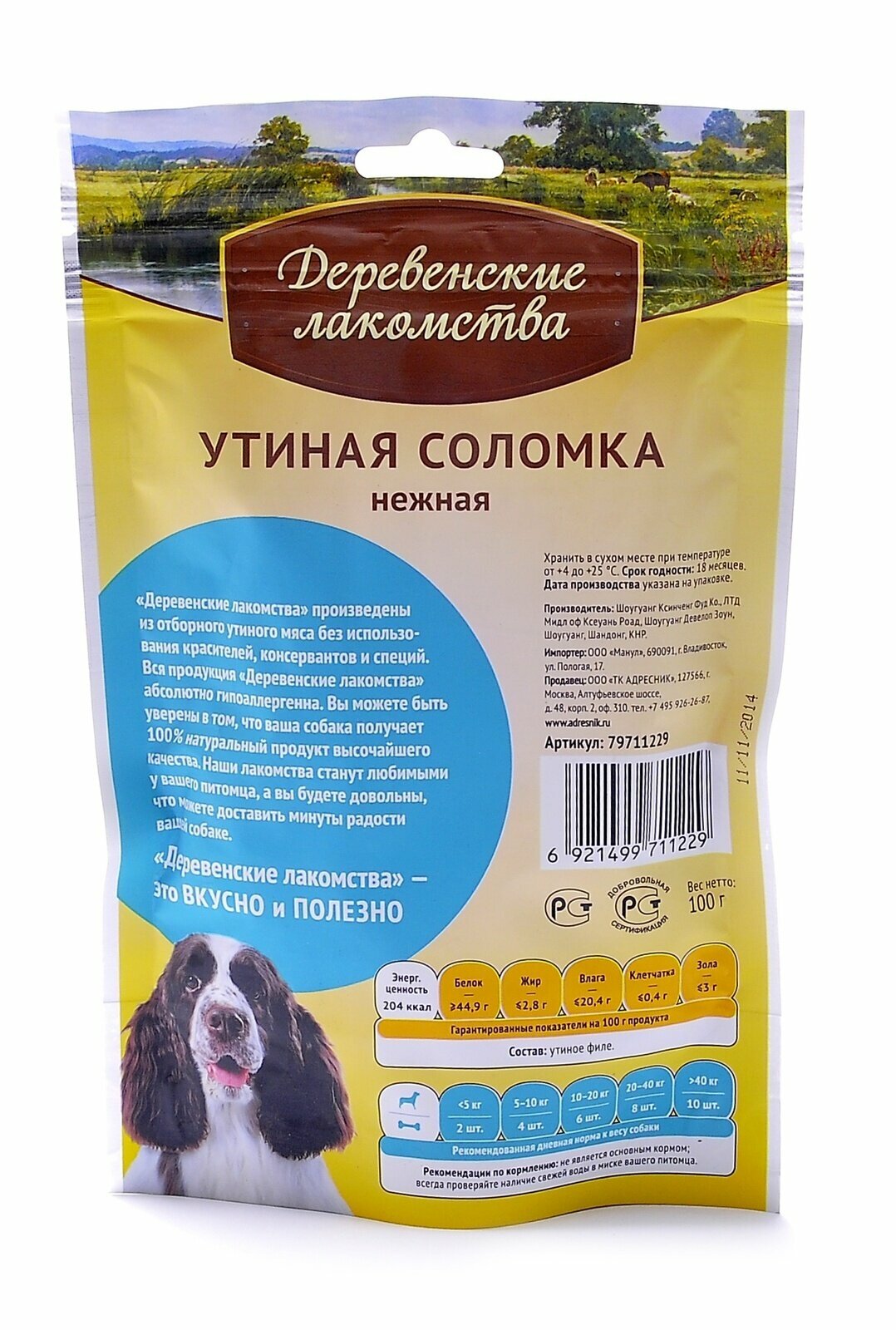 Деревенские лакомства Утиная соломка нежная для Собак (100% мясо), 90г 0.09 кг